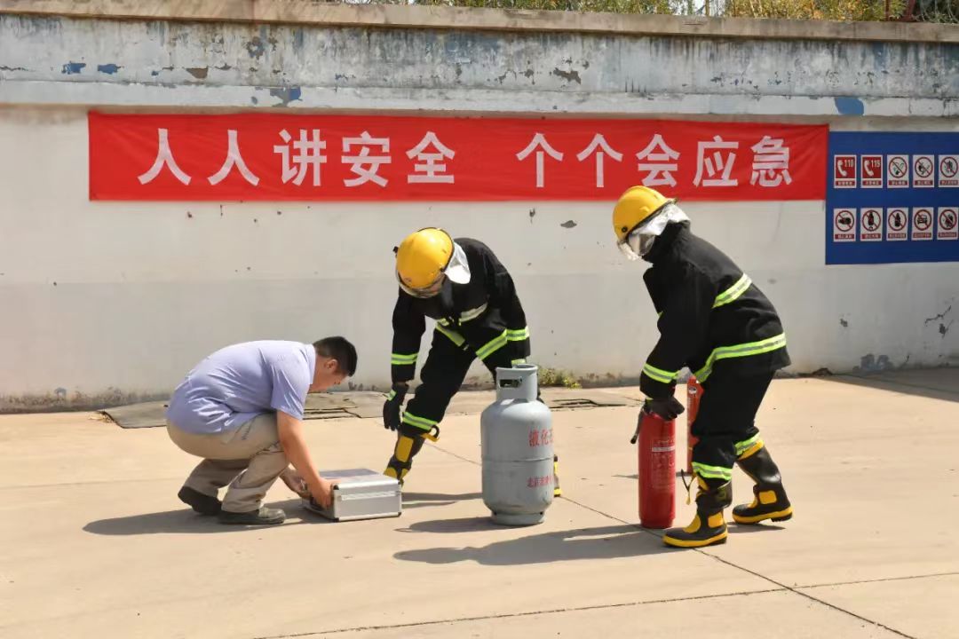 当天,现场模拟演练了液化石油气储罐发生泄漏事故,巡检员关闭阀门后迅速上报,应急指挥部接报后立即启动应急预案,现场拉起警戒线。随后,指挥人员、灭火小队、疏散保障人员、检测小组有序进场,组织居民疏散、抢修、二次检测等应急救援全环节。
