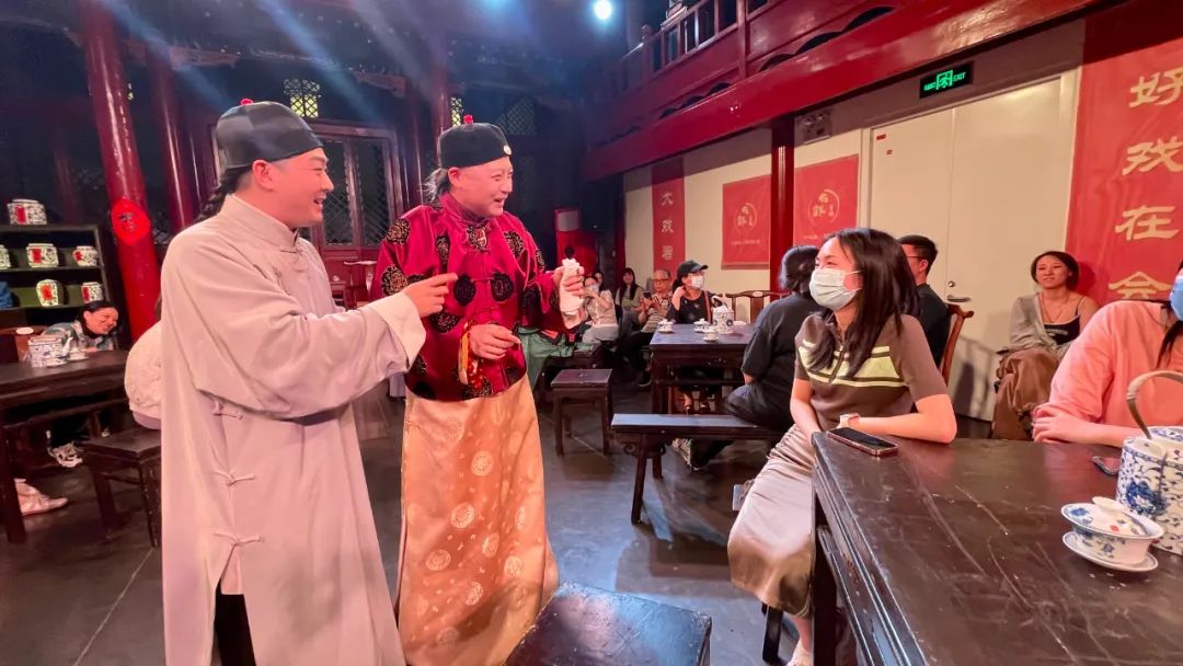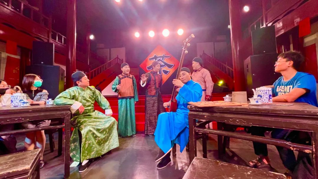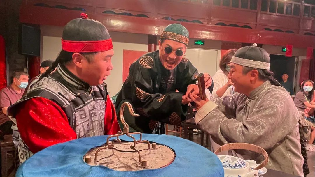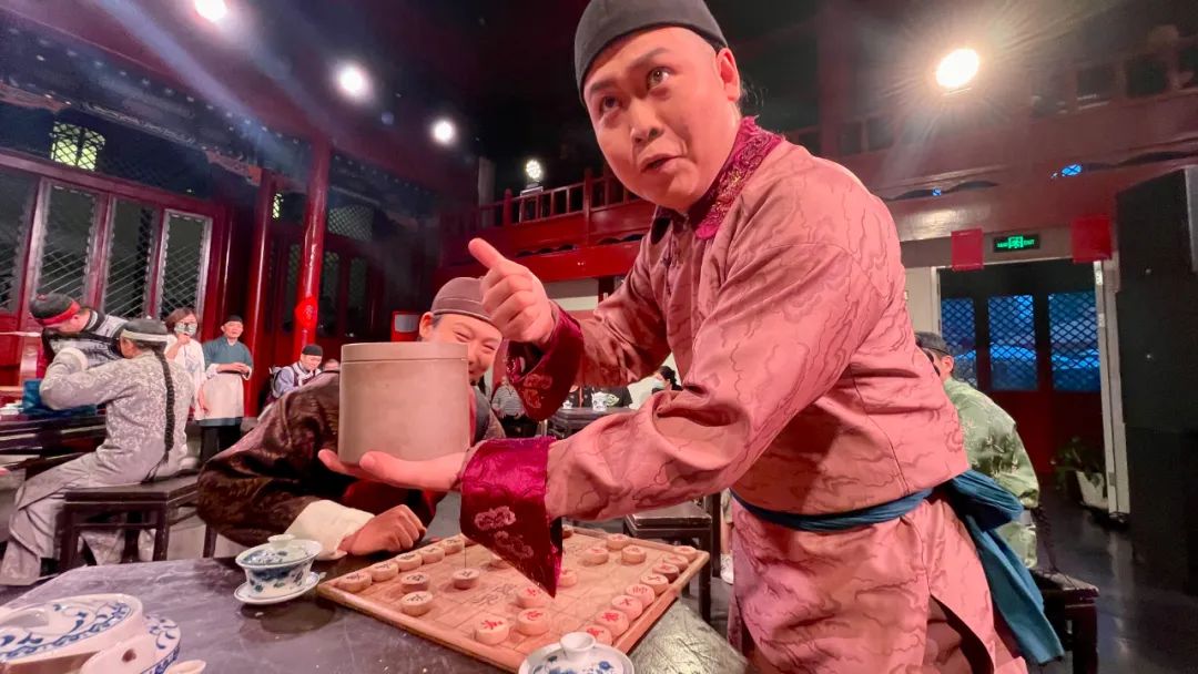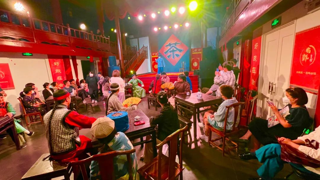 往常在舞台上听得着、喝不着,现在,来颜料会馆看北京曲剧沉浸式《茶馆》演出,观众不仅可以听曲儿喝茶、当一回戏中人,出门来还能赏一番胡同风光、尝一尝悦合颜新京菜,再惬意不过。
