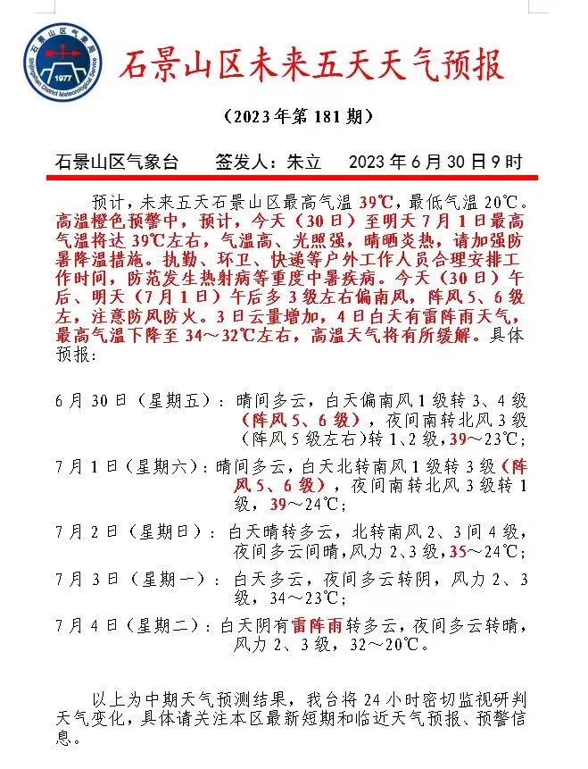 气象部门提醒,周末两天(7月1日、7月2日),北京以晴为主,高温持续,最高气温36℃至39℃,最低气温24℃至25℃。其中,明天高温达本轮过程的顶峰,最高气温39℃,午后有5至6级阵风。紫外线很强,公众请注意防暑防晒,谨防中暑。天干物燥,需注意用火用电安全。
