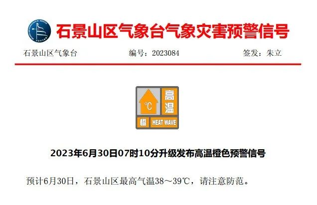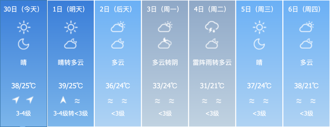 今天(30日)午后、明天(7月1日)午后多3级左右偏南风,阵风5、6级。周末两天,北京以晴为主,高温持续,最高气温36~39℃,最低气温24~25℃。其中,明天高温将达本轮过程的顶峰,最高气温39℃。