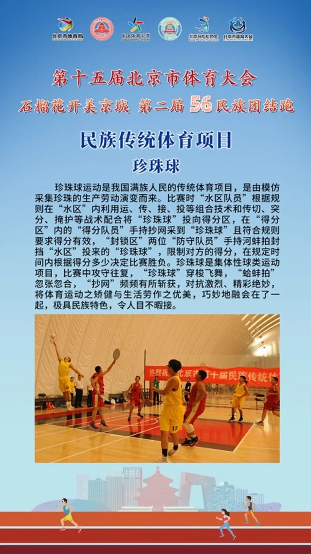 “石榴花开美京城 第二届56民族团结跑”活动紧紧围绕铸牢中华民族共同体意识,以“踔厉奋发新征程 全民健身向未来”“中华民族一家亲 同心共筑中国梦”为主题,通过线上与线下相结合的方式举办。继5月28日线下跑活动成功举办后,6月30日,由北京市体育局、北京市民族宗教事务委员会、北京市体育总会主办,北京市体育总会秘书处、北京市民族传统体育协会、北京马拉松协会承办的 “石榴花开美京城 第二届56民族团结跑”线上跑活动圆满收官。