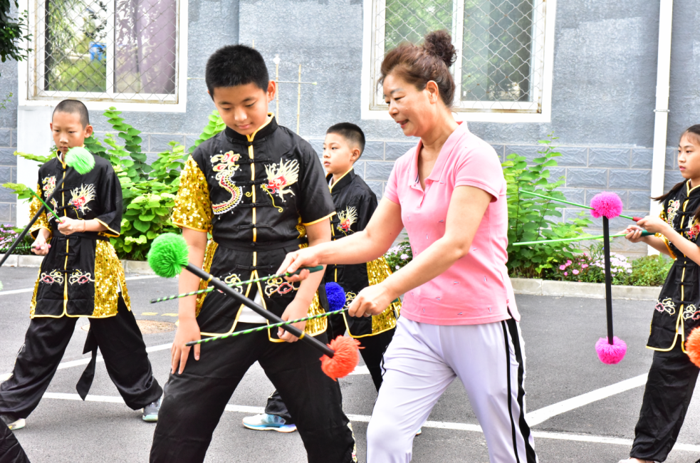 旱地拔葱、鲤鱼摆尾、出水芙蓉、翻江倒海……7月5日,延庆区第一小学“花棍”训练队的同学们聚在一起抓紧时间排练,为即将到来的北京市第十一届民族传统体育运动会做着准备。