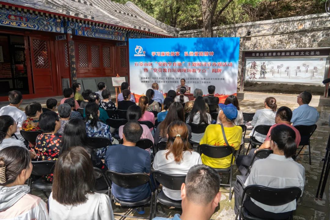 淬炼党性酷暑日,砥砺奋进正当时。7月5日下午,中共石景山区委宣传部、中共石景山区委组织部、石景山区文化旅游局依托慈善寺廉政教育基地,联合开展“党的孕育地”主题阅读宣传周活动,并为“石景山区党员教育培训现场教学点”慈善寺文物保管所教学点揭牌,积极拓展阅读新场景,宣传推广廉政主题图书,开展阅读分享活动,使广大党员干部感受了一堂生动的“沉浸式”党风廉政思政课。