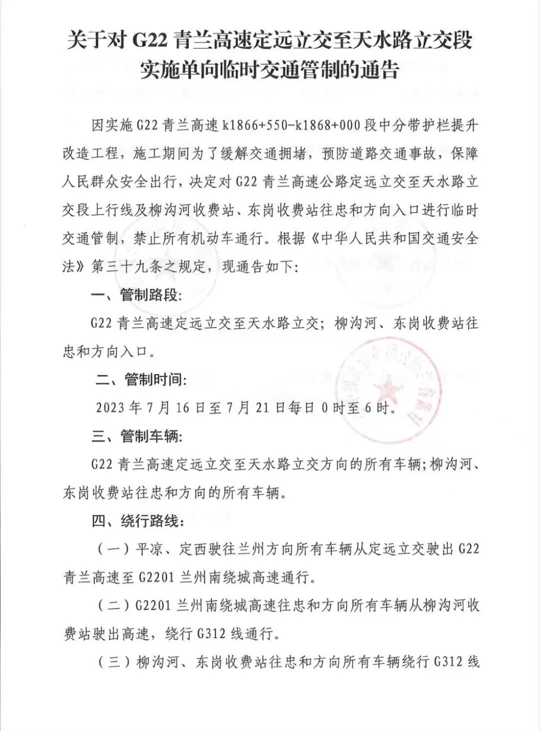四、绕行路线:(一)平凉、定西驶往兰州方向所有车辆从定远立交驶出G22青兰高速至G2201兰州南绕城高速通行。(二)G2201兰州南绕城高速往忠和方向所有车辆从柳沟河收费站驶出高速,绕行G312线通行。(三)柳沟河、东岗收费站往忠和方向所有车辆绕行G312线通行。