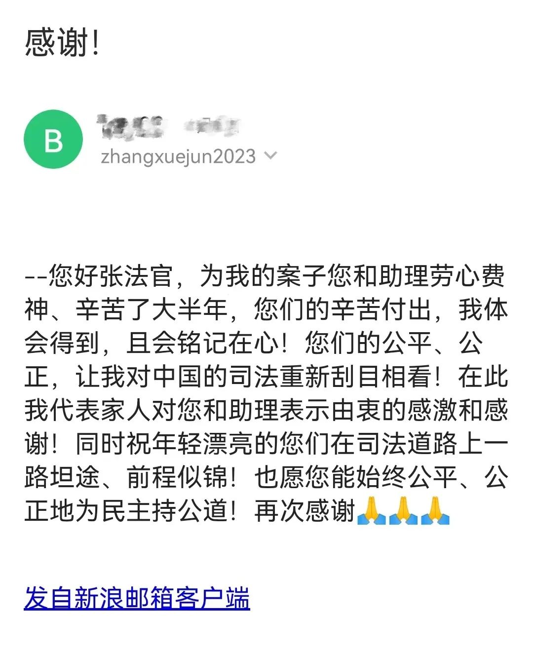 邮件虽轻,却承载人民群众对司法工作的认可;词句无华,却体现了当事人对法院工作的信任。张学君法官表示:“看到当事人的感谢信,一天的疲惫一扫而空。能切切实实查明案件真相,维护各方当事人的合法权益,再苦再累都值得。”