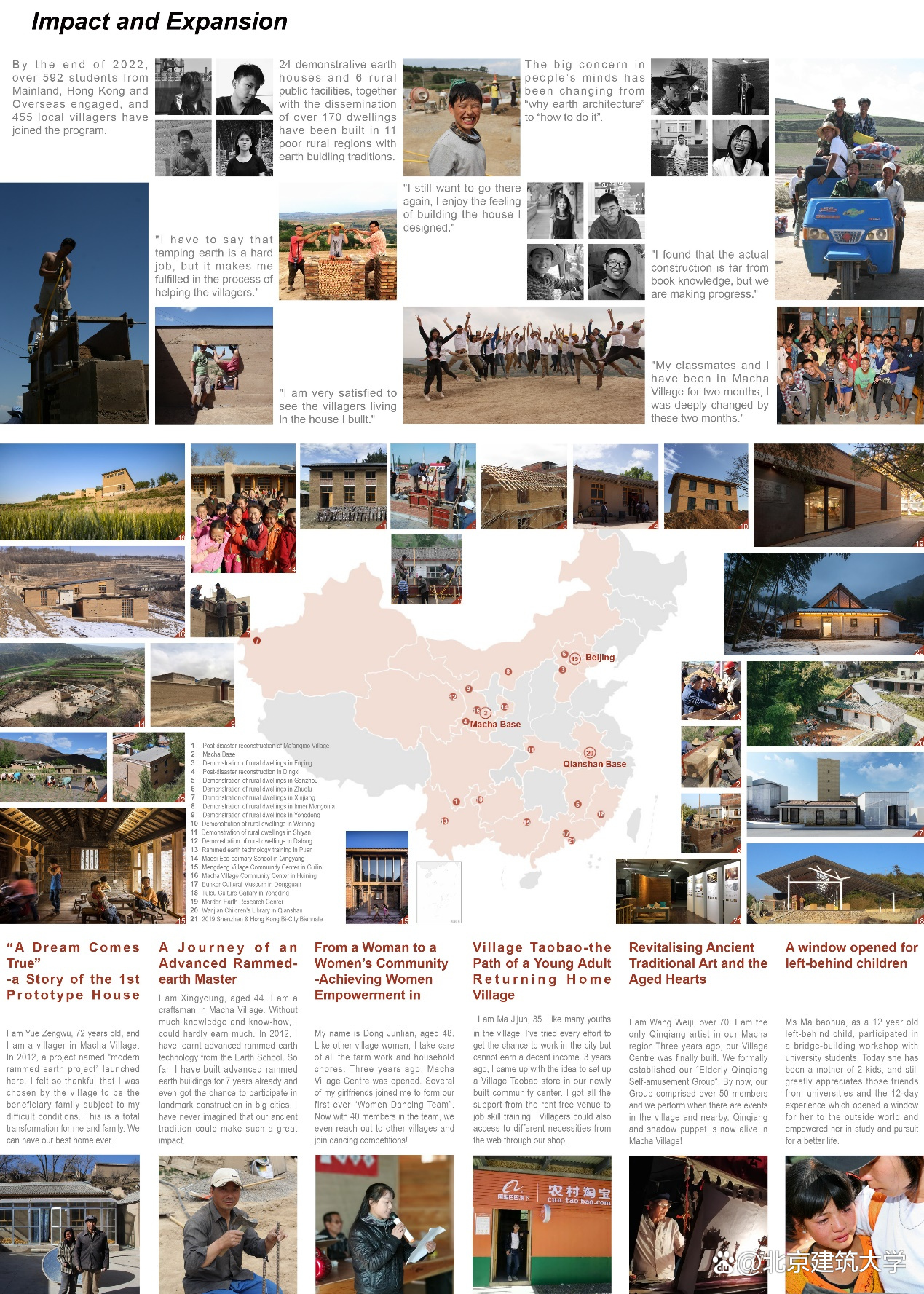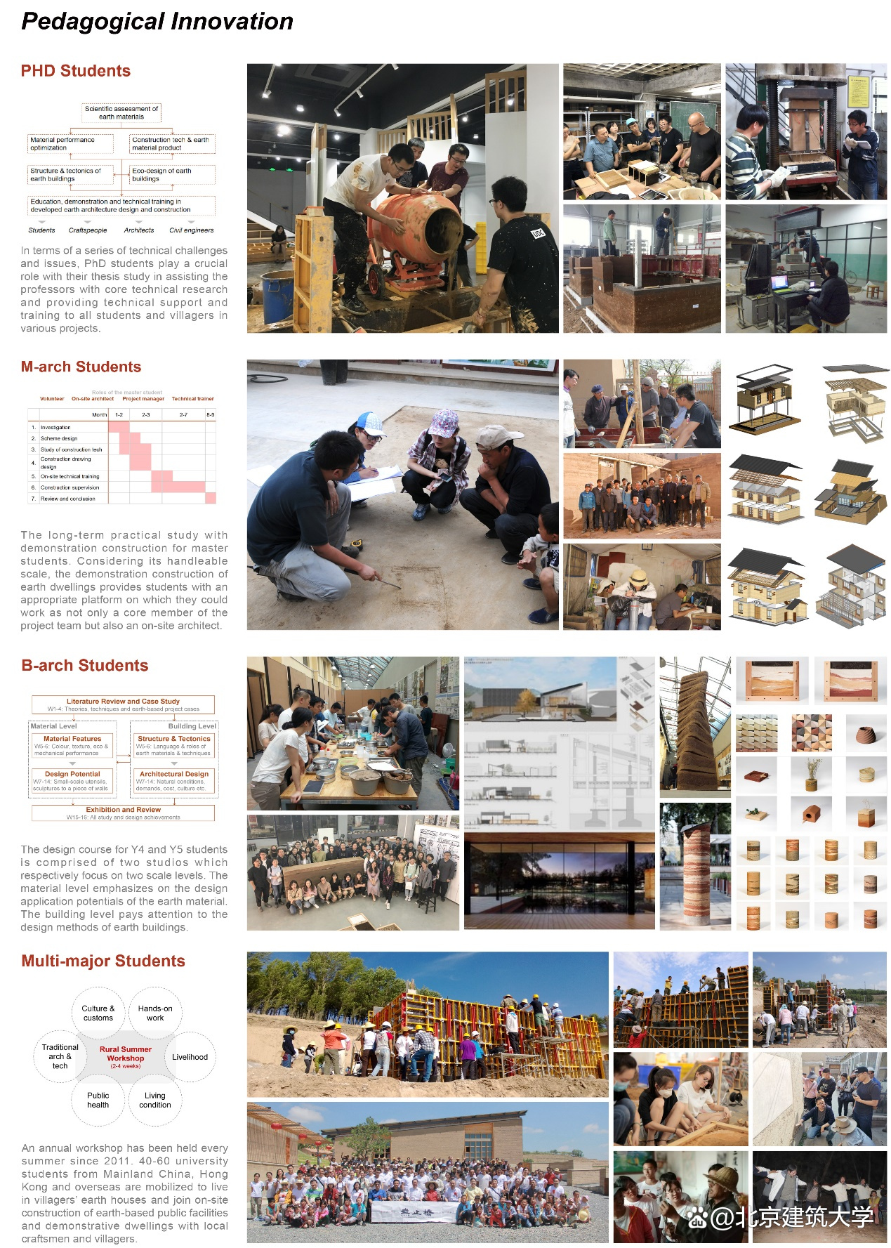 自2011年以来,在住房和城乡建设部的指导下,穆钧教授团队基于在传统营建技术革新与绿色建筑方面取得的科研成果,联合西安建筑科技大学、中国城市规划设计研究院等多个高校或科研机构师生团队,结合课程教学、暑期工作营、研究生论文、社会实践等多种教学形式,在甘肃、青海、新疆、福建、安徽、河北等17个省或地区与当地村民相互协作,一同开展绿色农房、乡村公建、基础设施以及传统民居活化改造等公益示范项目,逐渐形成了面向建筑学专业本硕博以及相关专业本科生的学研融合与多元协同教育模式,并全面契合了联合国设立的17项可持续发展目标。相关的教学和科研工作也到了无止桥慈善基金的支持。