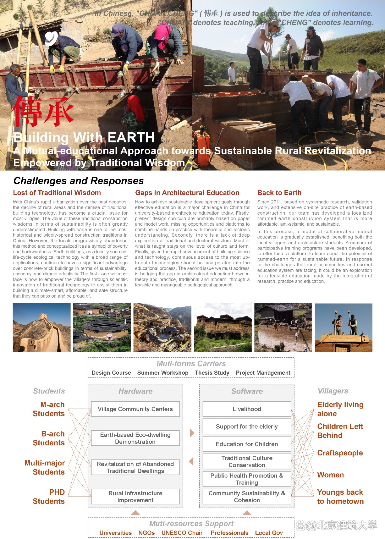 UIA建筑教育创新奖设立于2019年,面向全球范围内的建筑专业教育机构,旨在表彰跨文化、跨地域的多元化建筑教育创新,发掘有助于推动可持续发展、具有启发示范意义的教学实践。本届评审委员会基于“教学方法达到卓越水平”和“践行联合国可持续发展目标方面取得出色成就”两项评价标准,从全球五个UIA成员地区评选出4个高校项目授予创新奖,我校建筑与城市规划学院团队开展的“土生土长:基于传统传承的可持续乡村振兴与多元协同教育”项目荣获其中的一项。