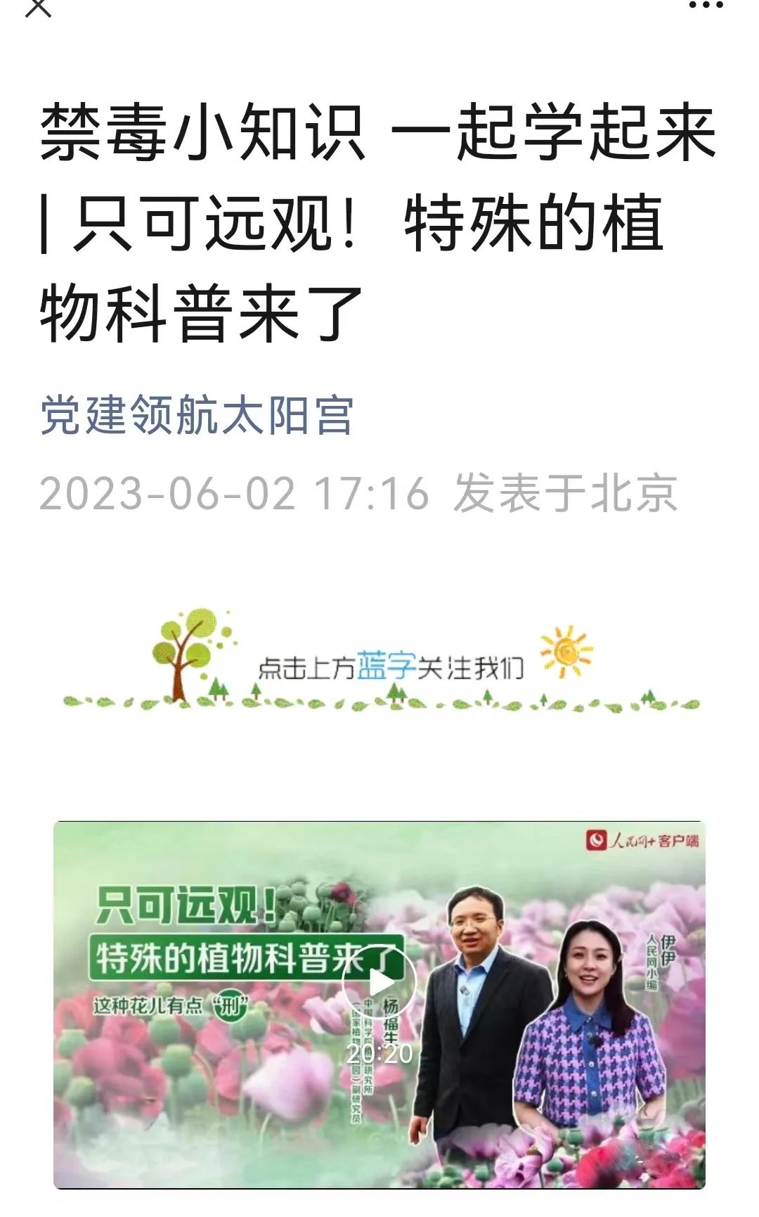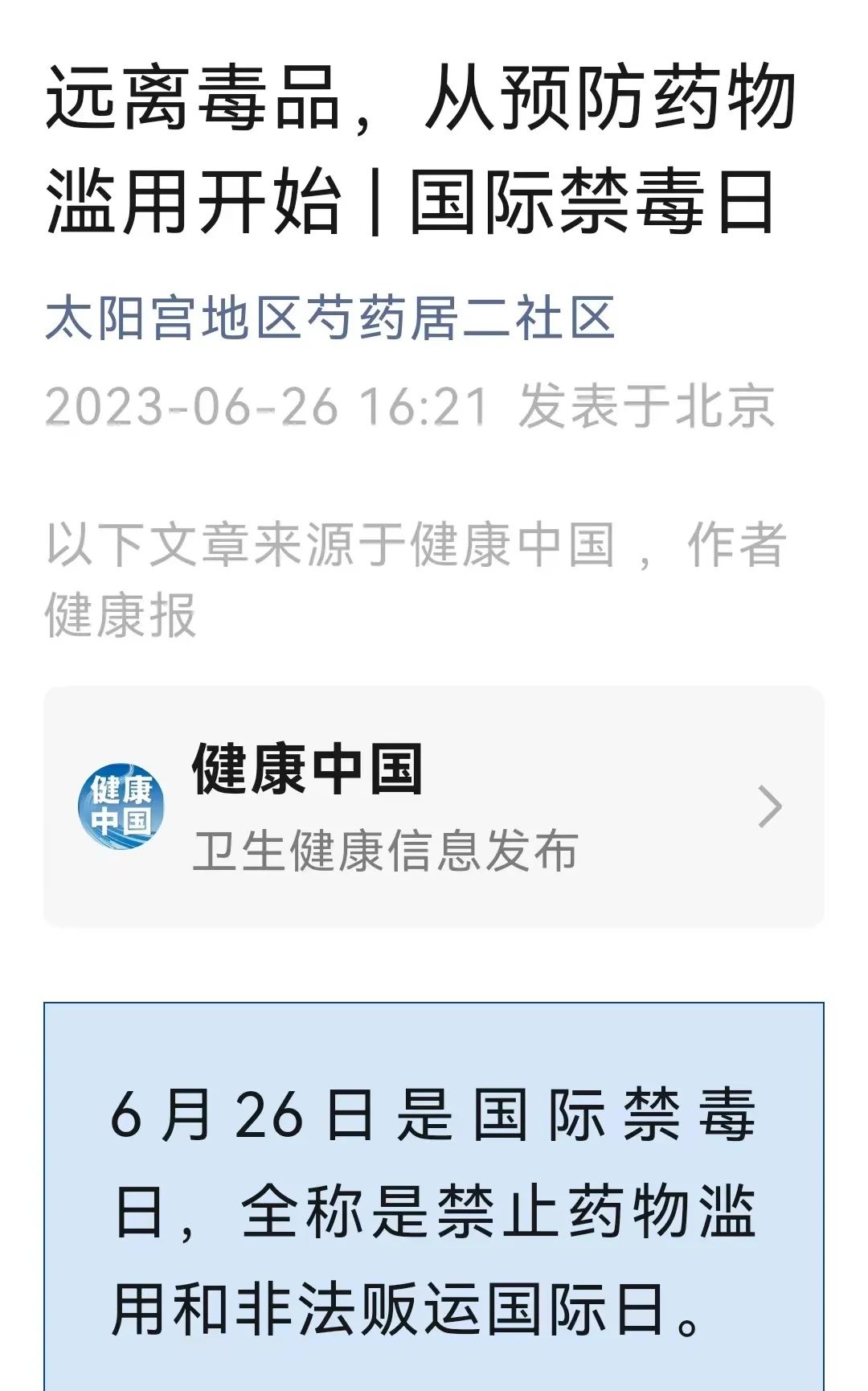 以“党建领航太阳宫”微信公众号作为线上主阵地,社区公众号、楼门微信群有效衔接补充,打通禁毒宣传“最后一公里”,并在线发起“平安太阳宫,禁毒在行动”禁毒宣传活动,科普系列禁毒知识。