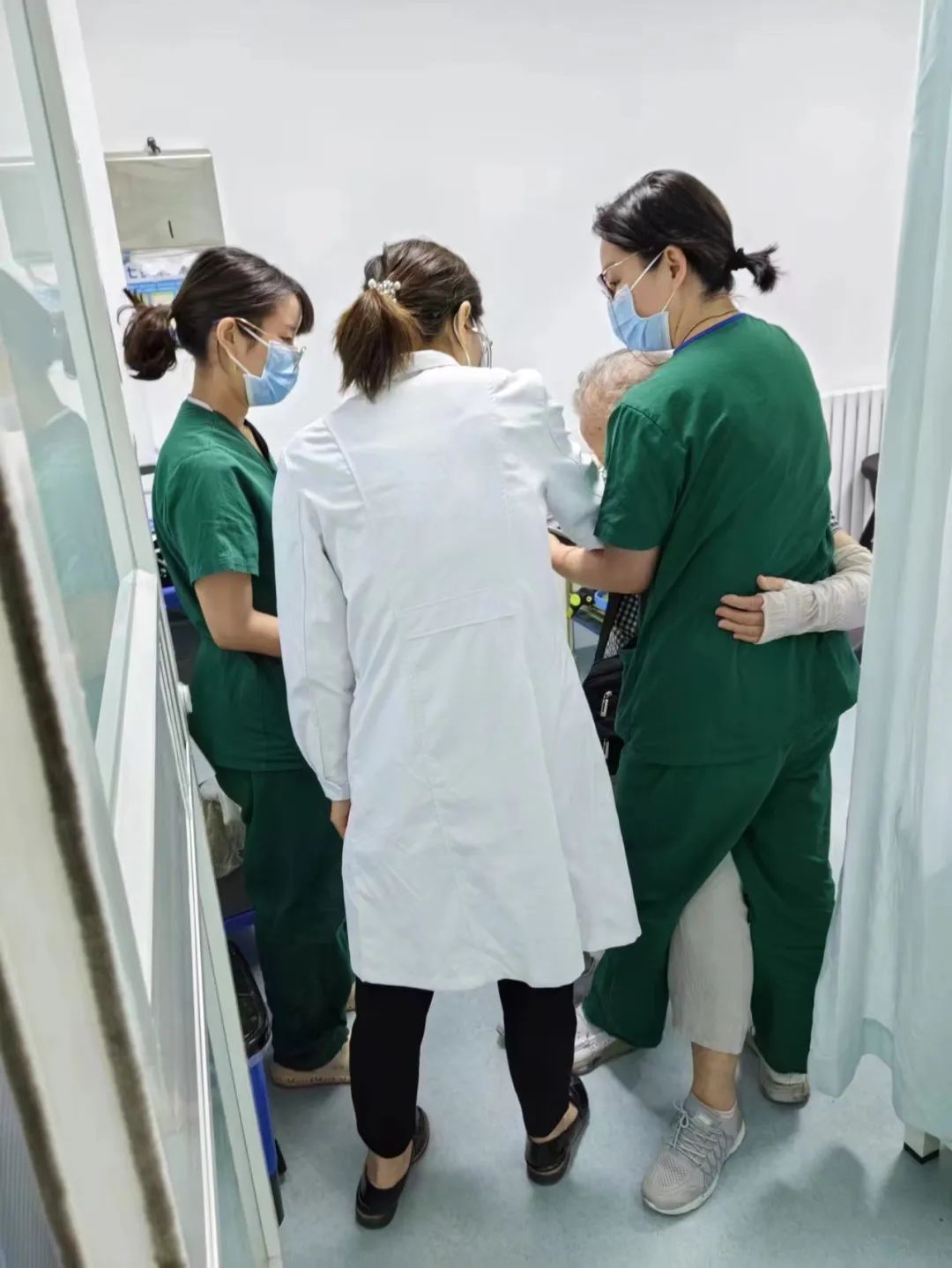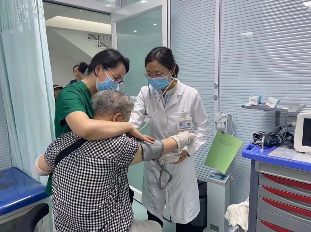 7月1日一早,随着气温的攀升,镇国寺北街社区卫生站就诊居民也逐渐增多。站长刘峰突然发现缴费队伍中有个老人神色不对,她迅速跑到老人面前,发现老人面色苍白,大汗淋漓,有气无力,急忙上前抱住并喊来其他工作人员,将老人搀扶到抢救室,医生阴文丽赶忙向正在看诊的患者说道:“抱歉,情况有些紧急,您稍等一下,我先看一下老人的情况”。随后,拿着听诊器、血压计跑到老人床旁:“奶奶,我是全科医生阴文丽,有我在,您放心,您现在有什么不舒服的感觉?”
