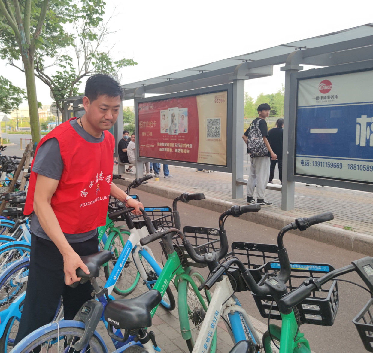 △志愿者在整理共享单车