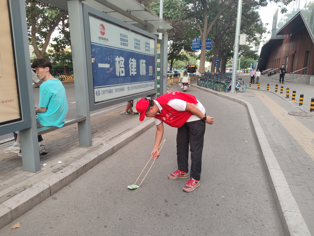 △志愿者在捡拾路边垃圾