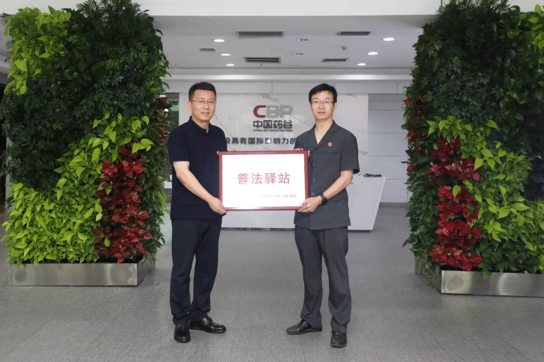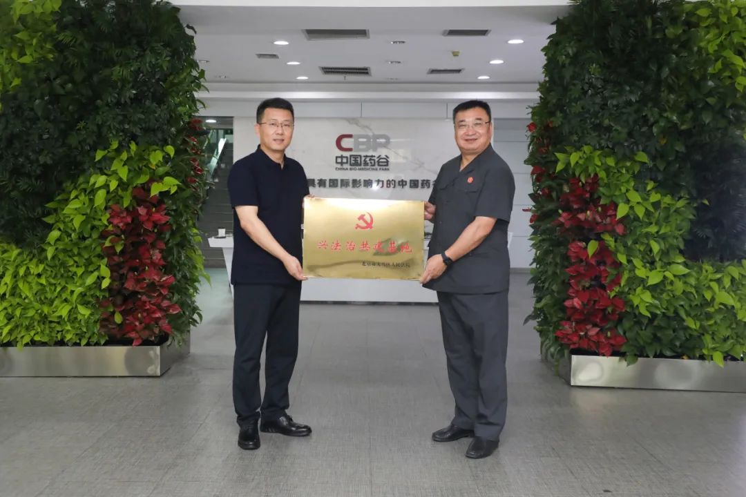 大兴法院党组成员、副院长王柏东,政治部副主任胡庆福与大兴生物医药基地工委书记吴浩共同为“兴法治共建基地”和“普法驿站”揭牌。