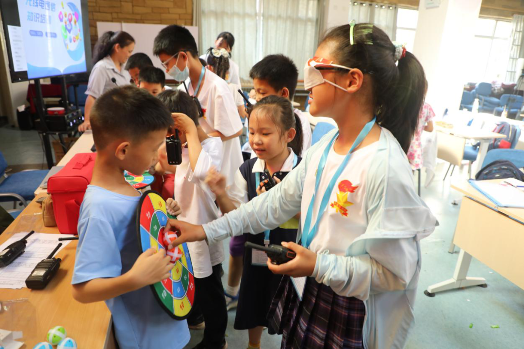 无线电通信讲师王羽飞给大家科普了什么是无线电通信、无线电通信能为我们做什么等小常识,并组织青少年们通过无线电对讲机进行通信联络和“贴鼻子”游戏。