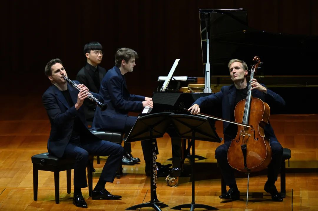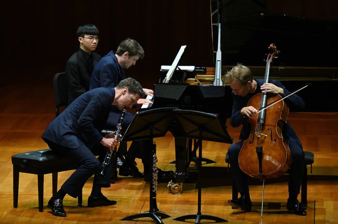 上场后三人非常干脆,没有对音环节,直接开始演奏贝多芬的《降B大调第四号三重奏》(Op.11)。这首作品的头四个小节是三个乐器的齐奏,稍有不慎就容易出现音准的瑕疵,但三人的演奏无可挑剔。贝多芬早期的古典风格被三人把握得恰到好处。无论是优美的旋律、英雄主义的快速跑动,还是顽皮的互动,三人的演奏都引人入胜。第二曲是当代作曲大师阿沃·帕特的一首致敬莫扎特的《柔板》。在作曲家精心设计的和声里,三个人充分展现了杰出的个人能力,在乐句的线条上连绵不绝,在音量的控制上时时气若游丝,在意境的营造上充满了色彩。上半场最后一套曲目选择了布鲁赫《为单簧管、大提琴和钢琴创作的八首乐曲》其中的三首。布鲁赫特有的浪漫风格凸显着极美的旋律,三人丝毫没有浪费每一次在乐句中大为抒情的机会。而精心设计过的快板段落则有着风起云涌般的能量与层次。