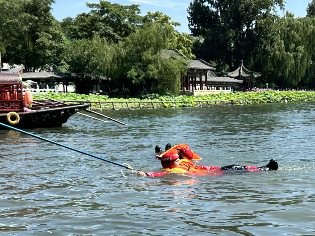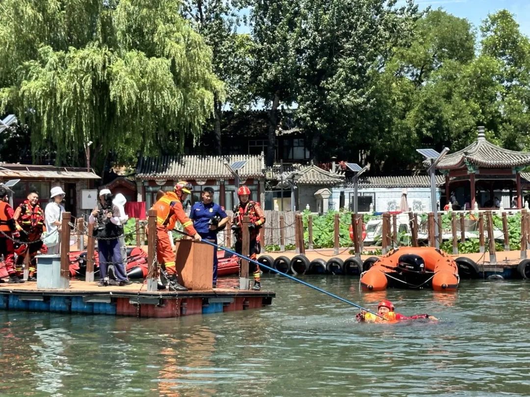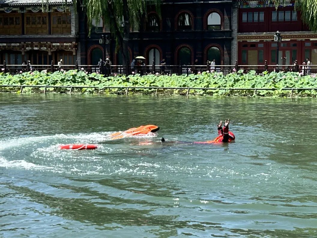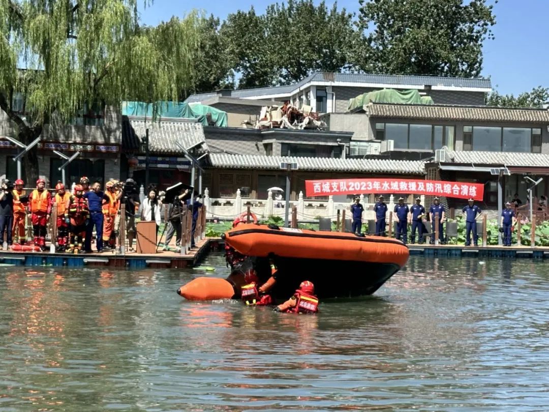 目前北京市即将进入汛期,为应对汛期突发情况,锻炼水域救援能力,7月14日上午,西城区消防救援支队在什刹海荷花市场码头开展水域救援及防汛演练。