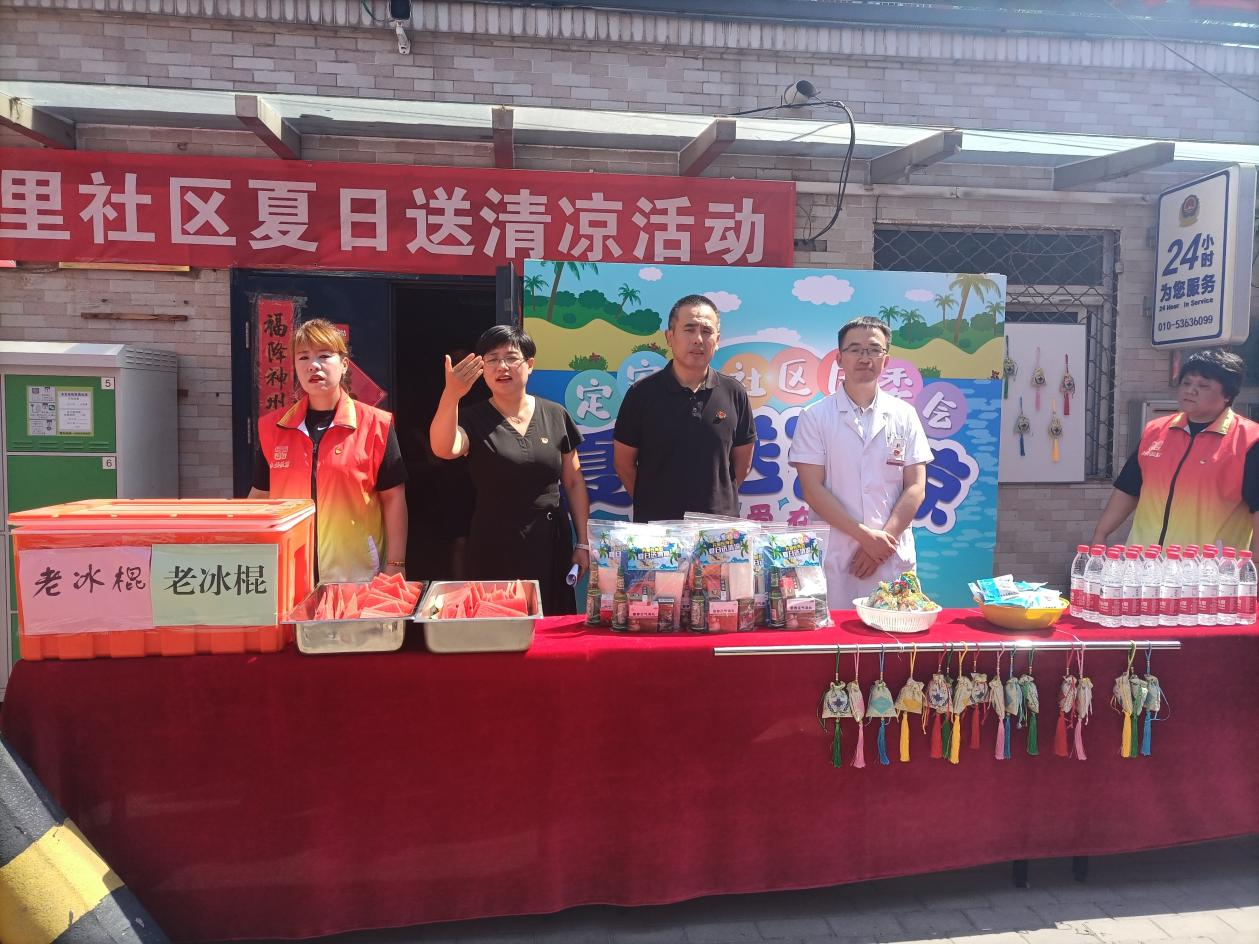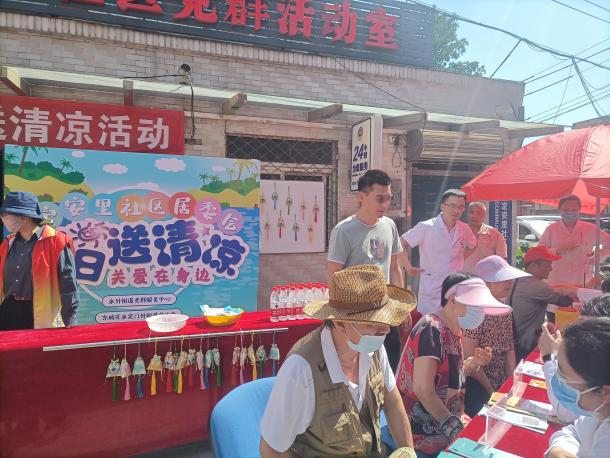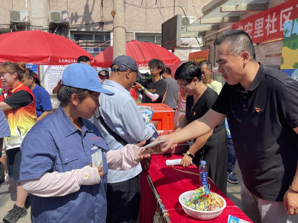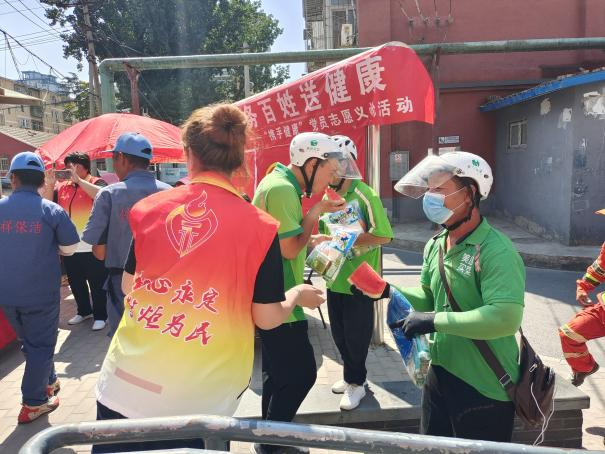 于是在7月10日,在入伏前一天,定安里社区居委会对接永外街道总工会、党群服务中心、社会工作服务中心以及东城区第一人民医院内科第一党支部相关资源,“党群阵地@你”的引领下联合开展“南岸风情•邻里守望之夏日送清凉”活动,为高温下的户外工作者们消暑降温送清凉。