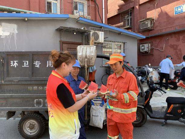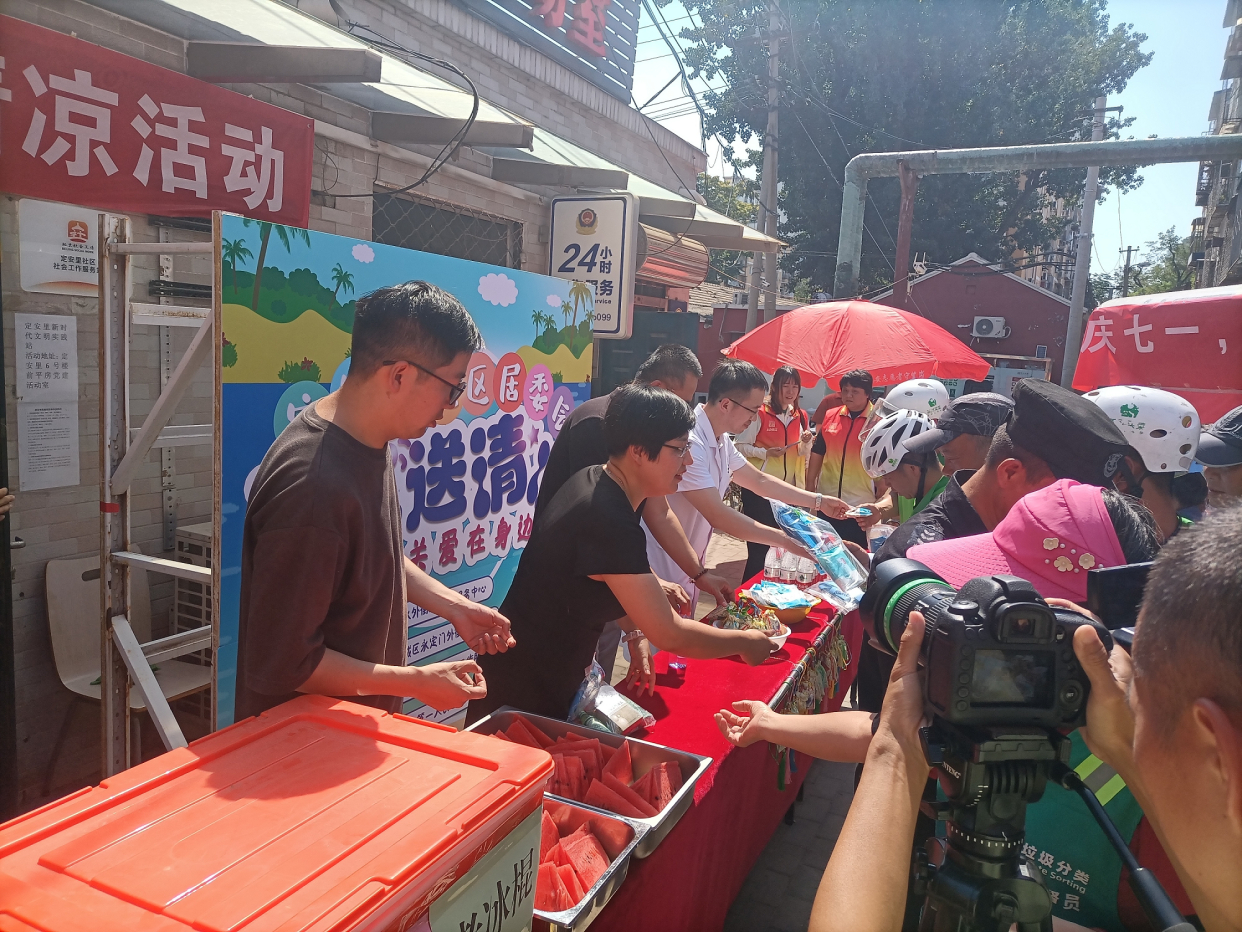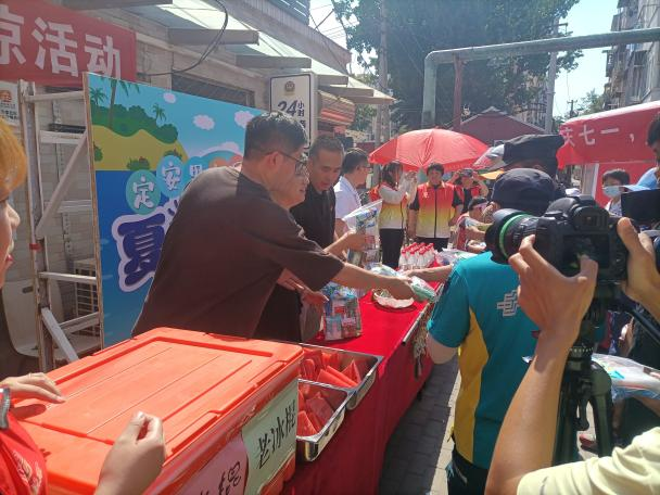 在定安里社区党群活动中心门前,社区设立清凉驿站,准备了清凉解渴的冰镇西瓜、老冰棍和矿泉水等,为奋战在一线的工作人员免费饮用,让大家“冒着暑气来,带着清凉回”。