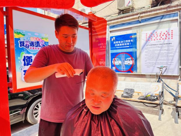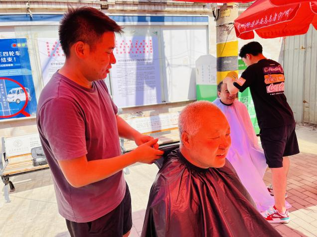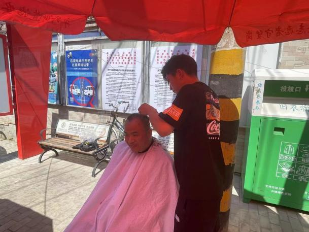 一把椅子 、一块围布、一个工具包,一个临时“理发店”就正式“开业”了。在义剪现场,理发师根据居民的需求,快速挥舞着手中的剪刀、推子等工具,用着娴熟的手法塑造了一个个既美观又清爽的发型。“最近天气太热,都不想出远门,今天在楼下就把头发剪了,这剪完了真是既精神又凉快。”居民张阿姨对工作人员连声称赞道。
