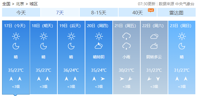 今天白天晴间多云,北转南风二三级,最高气温35℃;