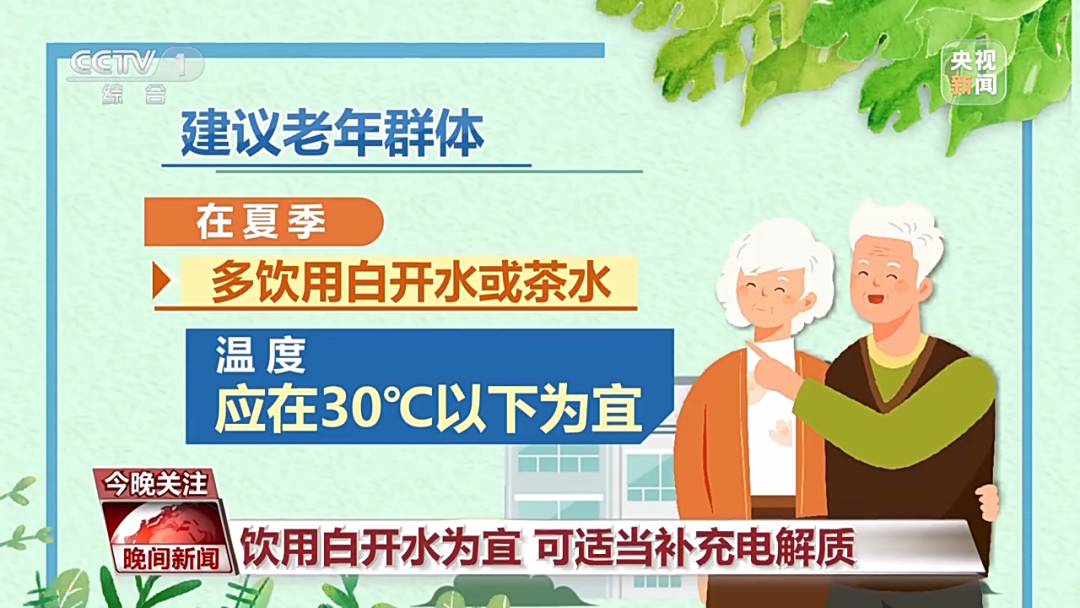 由于老年人的胃肠道功能下降,饮用冷饮可能会刺激其肠道蠕动,造成腹痛、腹泻的症状。因此建议老年群体在夏季多饮用白开水或茶水,温度应在30℃以下为宜。此外,专家介绍,夏季大量的出汗,除了会造成水分的丢失,还会导致人体内钠和钾的丢失。