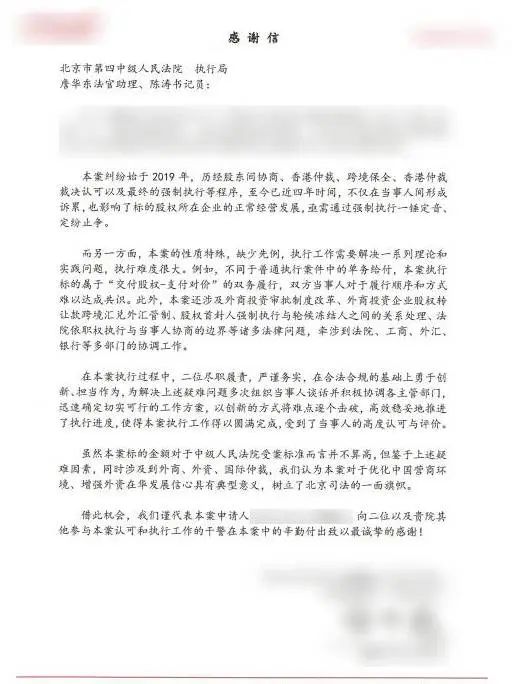 方案确定后,四中院执行局快速有序地推进了执行计划,前后用时仅20多天即全部办理完成。中方公司收到了2亿余元的股权转让款,外方公司也取得了目标企业股权,纠纷得以平稳化解。“本案性质特殊,缺少先例,对于优化中国营商环境、增强外资在华发展信心具有典型意义,树立了北京法院的一面旗帜!”外方公司委托代理人向四中院发来邮件,对于该起始于2019年的纠纷最终在北京法院得以解决表示衷心感谢。