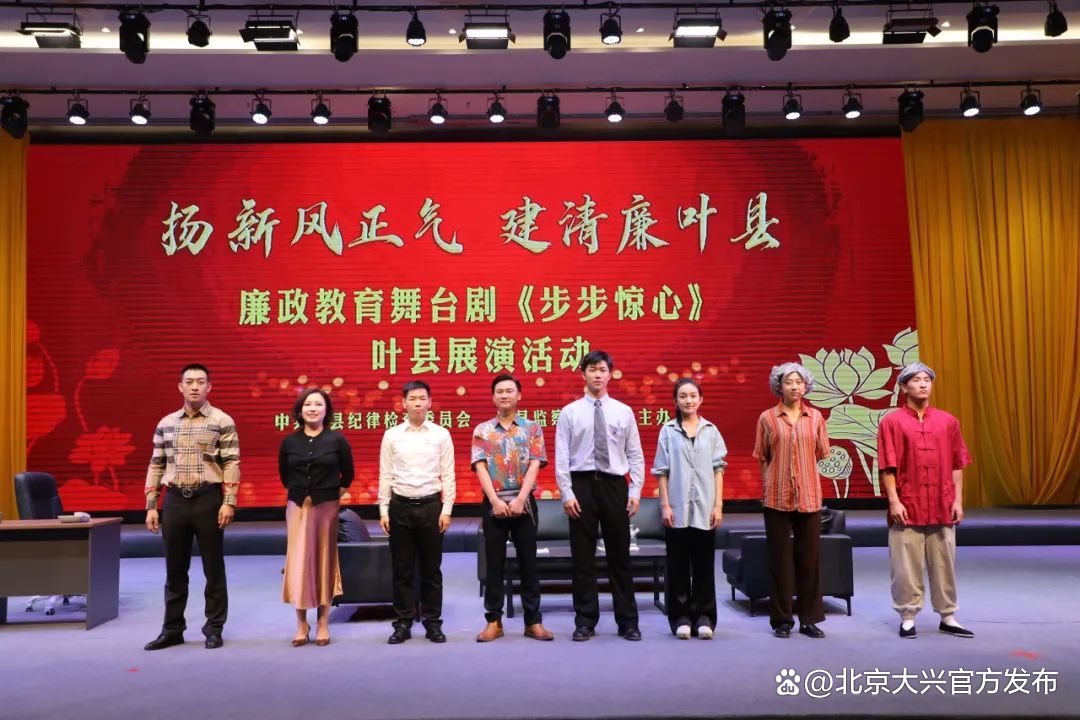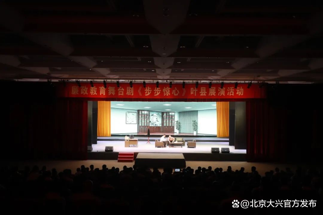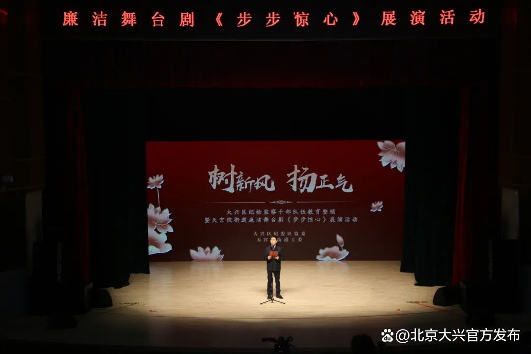 由大兴区纪委监委与天宫院街道联合制作的《步步惊心》廉洁教育舞台剧直击反腐严肃话题,以优良的剧本质量、完美的舞台呈现,首演便获得巨大成功,在社会上引起强烈反响,对全区乃至全市机关及企事业单位的党员干部、工作人员起到警示教育作用。更是走出“京”门,从“会场”搬到“剧场”,成为了多地纪律教育活动的生动“教材”。截至目前,已流动展演4场,近3000名党政干部“沉浸式”追剧。