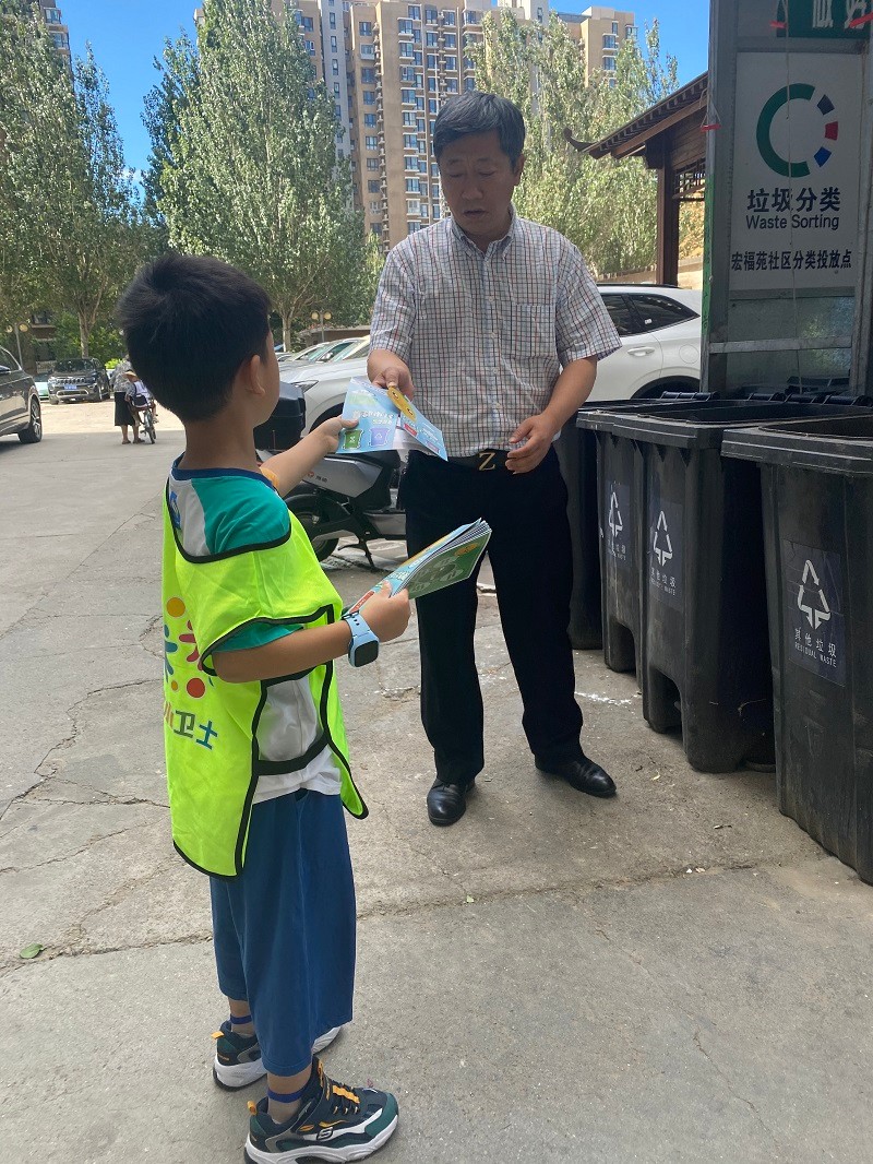 活动中,宏福苑西区社区工作人员通过日常生活中常见的垃圾种类,为孩子们讲解垃圾分类知识及常见误区,普及了《北京市生活垃圾管理条例》相关内容。同时,在互动体验环节,孩子们化身“宣传员”站在垃圾桶旁,利用手中的宣传材料,向来往居民普及如何正确投放垃圾。