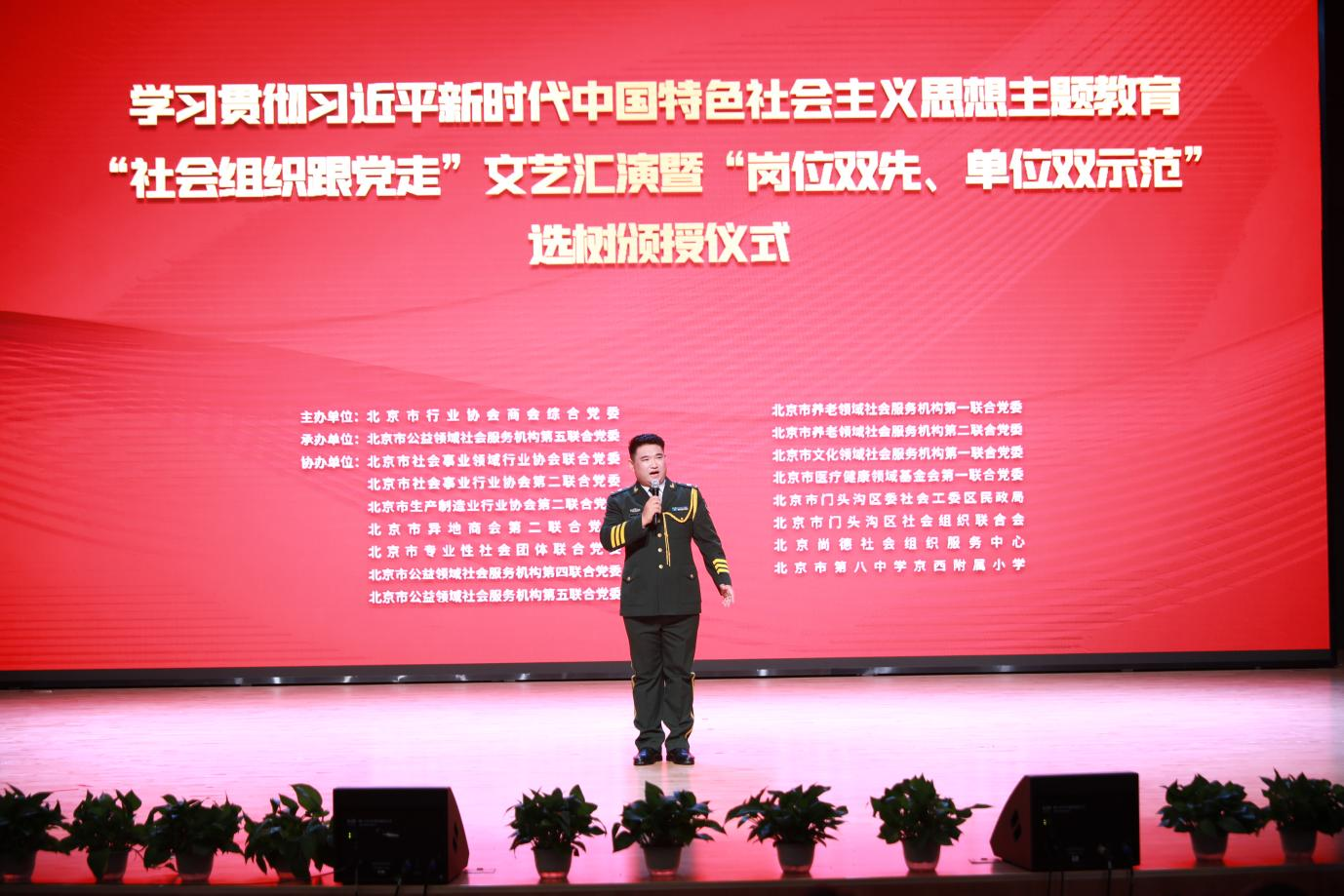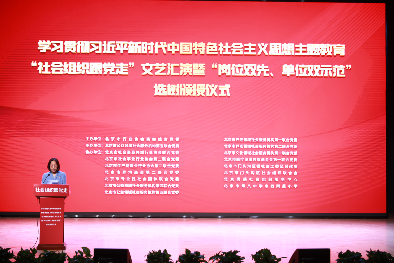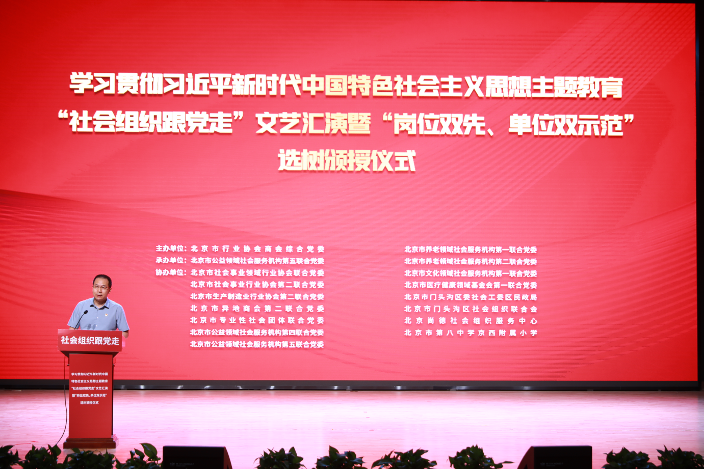近日,学习贯彻习近平新时代中国特色社会主义思想主题教育“社会组织跟党走”文艺汇演暨“岗位双先、单位双示范”选树颁授仪式成功举办,市委两新工委副书记、市委社会工委委员、市民政局副局长赵学刚参加活动并致辞。市行业协会商会综合党委副书记、市社会组织管理中心主任温育梁宣读《中共北京市行业协会商会综合委员会关于选树“党员示范岗先进个人”“党建管理岗先进个人”“党建工作示范单位”“支持党建工作示范单位”的决定》。综合党委系统52家联合党委书记、专职副书记、委员、党务工作者和选树的先进个人、示范单位代表共350余人参加活动。活动由北京市行业协会商会综合党委主办,北京市公益领域社会服务机构第五联合党委承办。