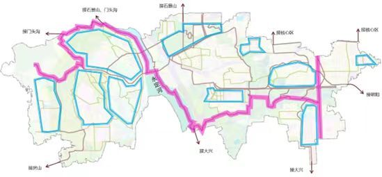 “一带”是指联系河西浅山、永定河、宛平城、南苑森林湿地公园、南中轴地区的绿道主线,构建“山-河-城-苑-轴”的绿道骨架。“十环”是指协同丽泽商务区、首都商务新区、中关村丰台园、花卉产业园等重要城市功能区形成的绿道环线,与城市空间互动,激活城市发展、提升城市活力。 “多支”是指联系百姓近邻生活的多条绿道支线,串联城市商业、商务、文化、体育等城市商业和文化设施,满足市民骑行娱乐和全民健身需求。