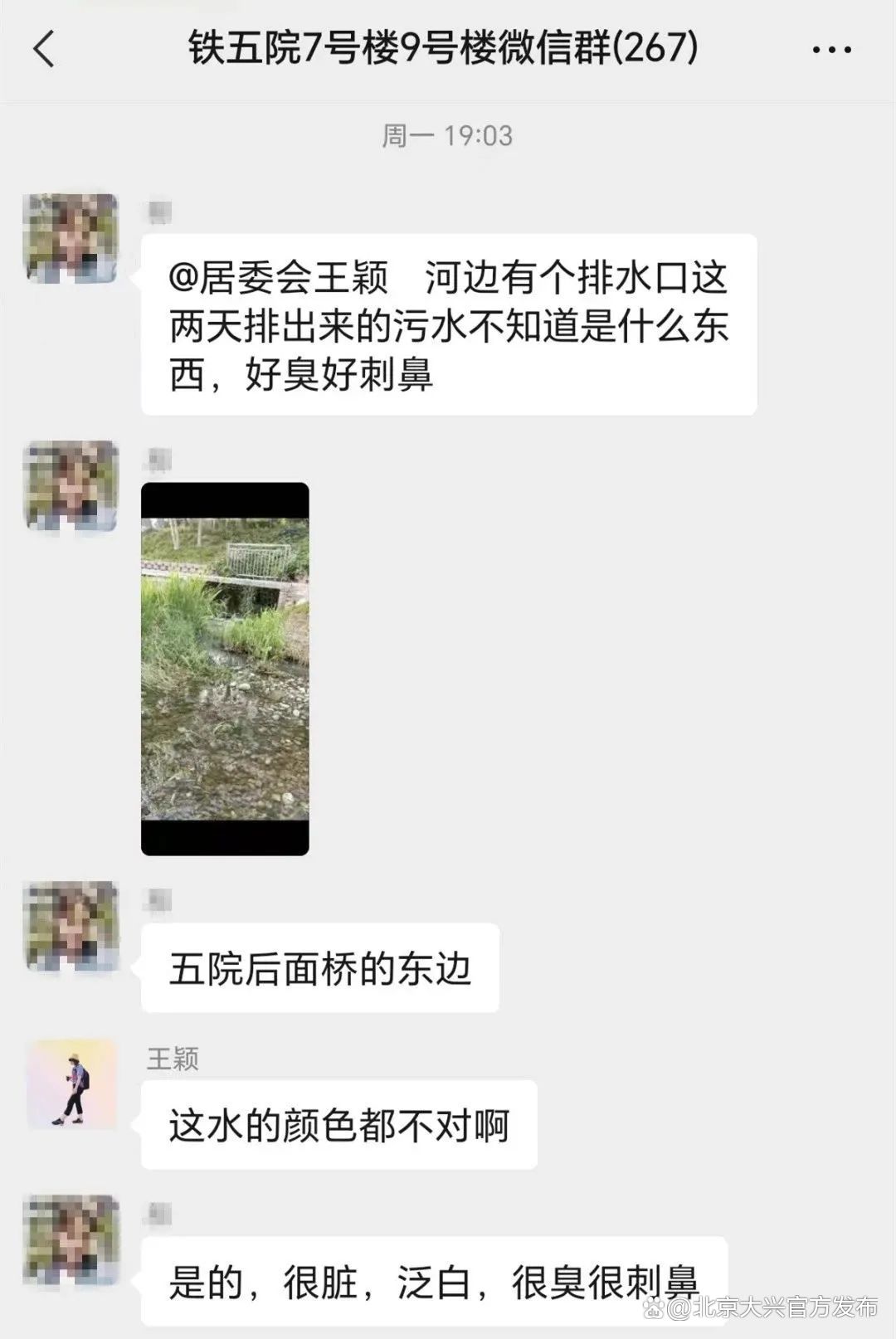 “河边有个排水口,这两天排出来的污水不知道是什么东西,好臭好刺鼻。”7月17日晚,家住康顺园社区铁五院小区的居民林女士在居民群里反馈,新凤河(清源段)的排污口有废水流出,异味刺鼻。由于小区临近该河段,常有居民晚间在此处散步遛弯。包楼社区工作人员王颖看到群里诉求后,第一时间回复并将情况上报给街道。