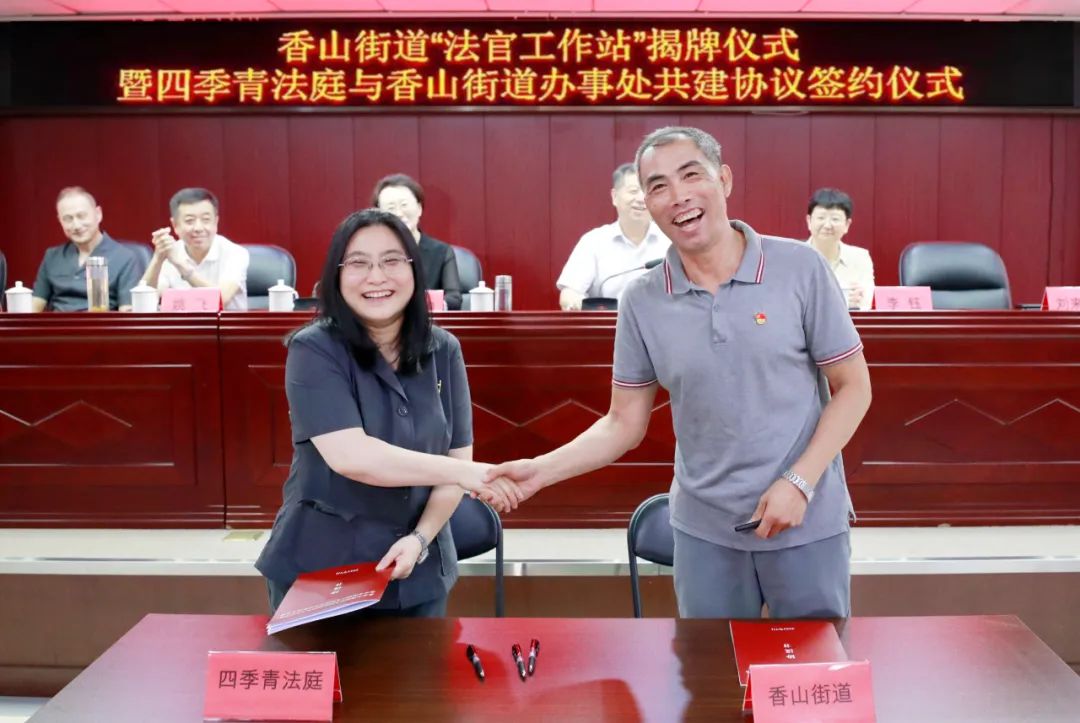 随后,海淀法院四季青人民法庭庭长周红与海淀区香山街道办事处主任刘来奇签订了共建协议。协议确认,双方将以“诉源治理”为主线,通过构建多元解纠、互访培训、精准普法、资源共享、协同送达等合作机制,从源头预防、减少街道矛盾纠纷发生,实现街道矛盾纠纷及时、高效、就地化解。协议中另对设立“法官工作站”、组建“街道调解团队”、建立预警研判机制、建立联动联治机制、建立12368“一号响应”诉源治理工作机制及推进人民法院调解平台“三进”工作等一系列具体事项进行了约定。