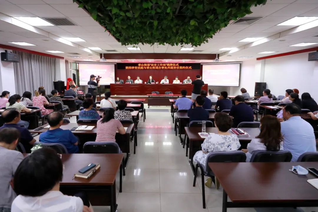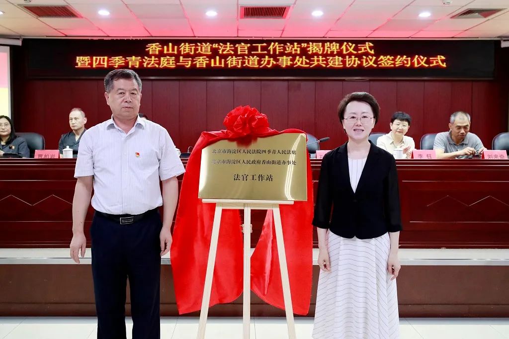 其次,海淀法院党组书记、院长邵明艳,海淀区香山街道党工委书记孙连红共同为“海淀区人民法院四季青人民法庭香山街道办事处法官工作站”揭牌。