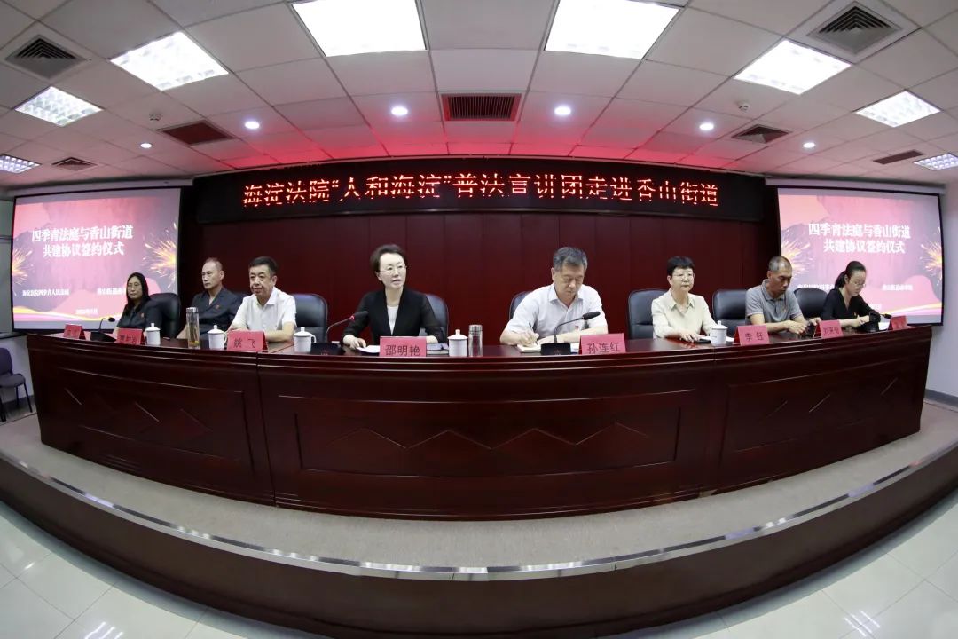7月18日下午,“海淀区人民法院四季青人民法庭香山街道办事处法官工作站”揭牌仪式暨四季青人民法庭与香山街道办共建协议签约仪式在海淀区香山街道举行,“人和海淀”普法宣讲团为街道开展了现场普法宣讲。海淀区人大代表姚飞、李珏,香山街道党工委书记孙连红、香山街道办事处主任刘来奇,海淀区法院党组书记、院长邵明艳及相关主管院领导、部门负责人出席本次活动,活动由海淀区香山街道办事处副主任张晶主持。