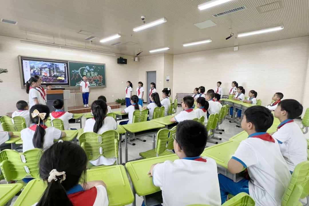在四(2)班的主题班会上,老师把讲台交给了学生。这堂班会以“美丽家园,我们为你点赞”为主题,学生们通过“为绿色点赞”“为蓝色点赞”“为红色点赞”的环节,表达了对高丽营镇在垃圾分类、环境建设、经济社会发展等方面的赞美之情。四(2)班学生李婉瑄说:“上完这节班会课让我更加了解了高丽营镇,这里环境优美,也很宜居,而且还有许多优秀人才回乡发展。长大后我也要像他们一样回到这里助力家乡发展。”