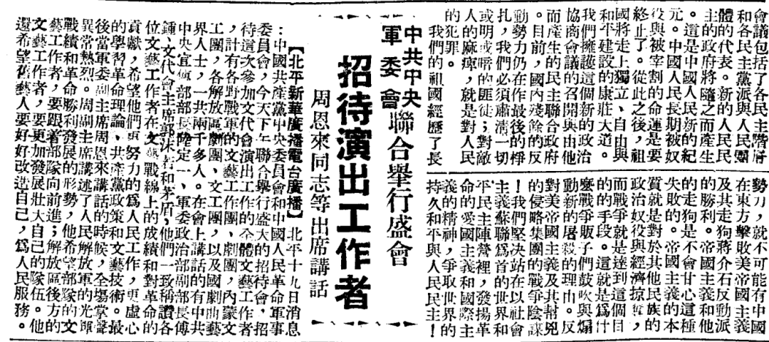 【北平新华广播电台广播】北平十九日消息:中国共产党中央委员会和中国人民革命军事委员会,今天下午联合举行盛大的招待会,招待这次参加文代会演出工作的全体文艺工作者,计有各野战军的文艺工作团、剧团,内蒙文工团,各解放区剧团、文工团,以及国剧曲艺界人士,一共两千多人。在会上讲话的有中共中央宣传部部长陆定一、军委政治部副部长傅钟、文代会主席郭沫若和茅盾,他们一致称赞各位文艺工作者在文艺战线上的成绩和对革命的贡献,希望他们再努力的为人民工作,更虚心的学习革命理论、共产党政策和文艺技术。最后当军委副主席周恩来讲话的时候,全场掌声异常热烈。周副主席讲述了人民解放军的光辉战绩和革命胜利发展的形势,他希望部队的文艺工作者,要跟着部队向前进;解放区后方的文艺工作者,要更加发展壮大自己的队伍。他还希望旧艺人要好好改造自己,为人民服务。