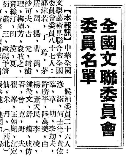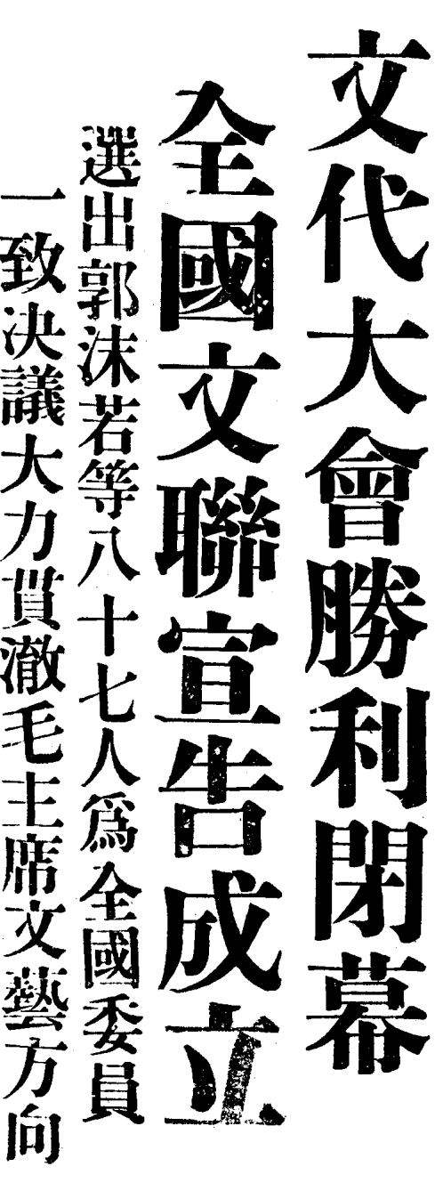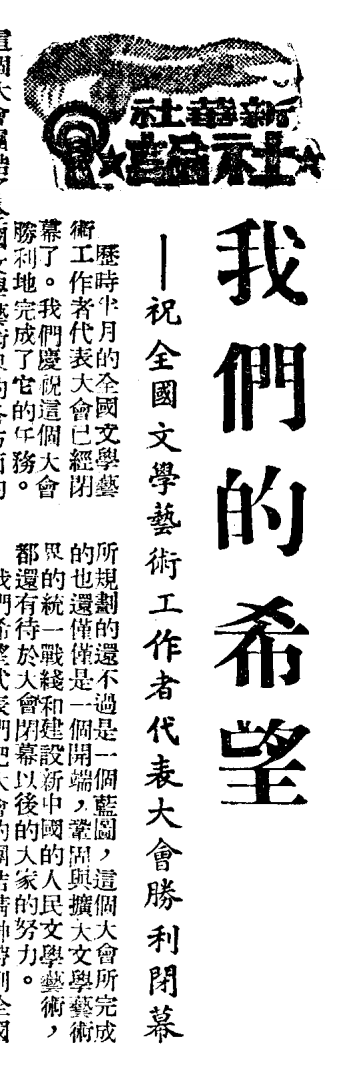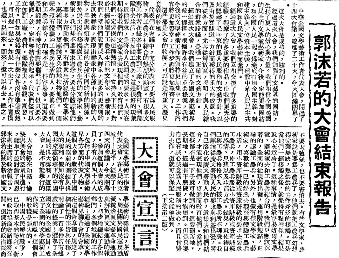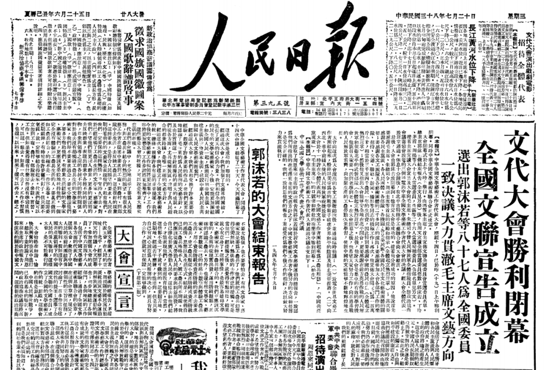 同时,在今日同版面中也登载了《文代大会演出戏剧电影招待全体代表》《文代大会胜利闭幕 全国文联宣告成立 选出郭沫若等八十七人为全国委员 一致决议大力贯彻毛主席文艺方向》《郭沫若的大会结束报告》《大会宣言》《全国文联委员会委员名单》《我们的希望——祝全国文学艺术工作者代表大会胜利闭幕》六篇文代会的相关报道。