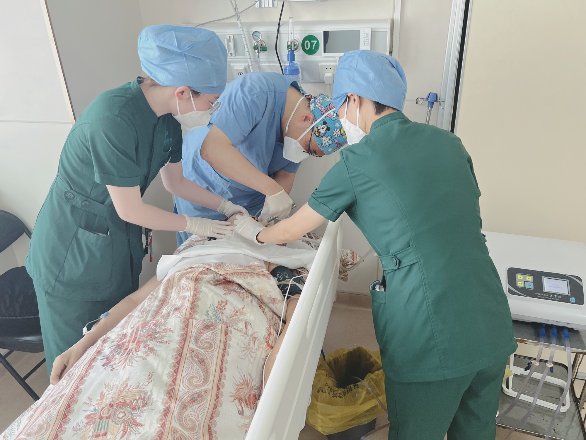 对症支持吸氧、心电监护、氧饱和度监测;开放静脉通路进行补液保肝对症支持治疗;抽血化验,同时送毒物检测;立即清水洗胃阻止药物吸收……在缪国斌主任的带领下,值班医生周虹副主任医师、崔娟主治医师、陈丽娟护士长等医护团队并肩作战,床旁抢救工作有序进行。