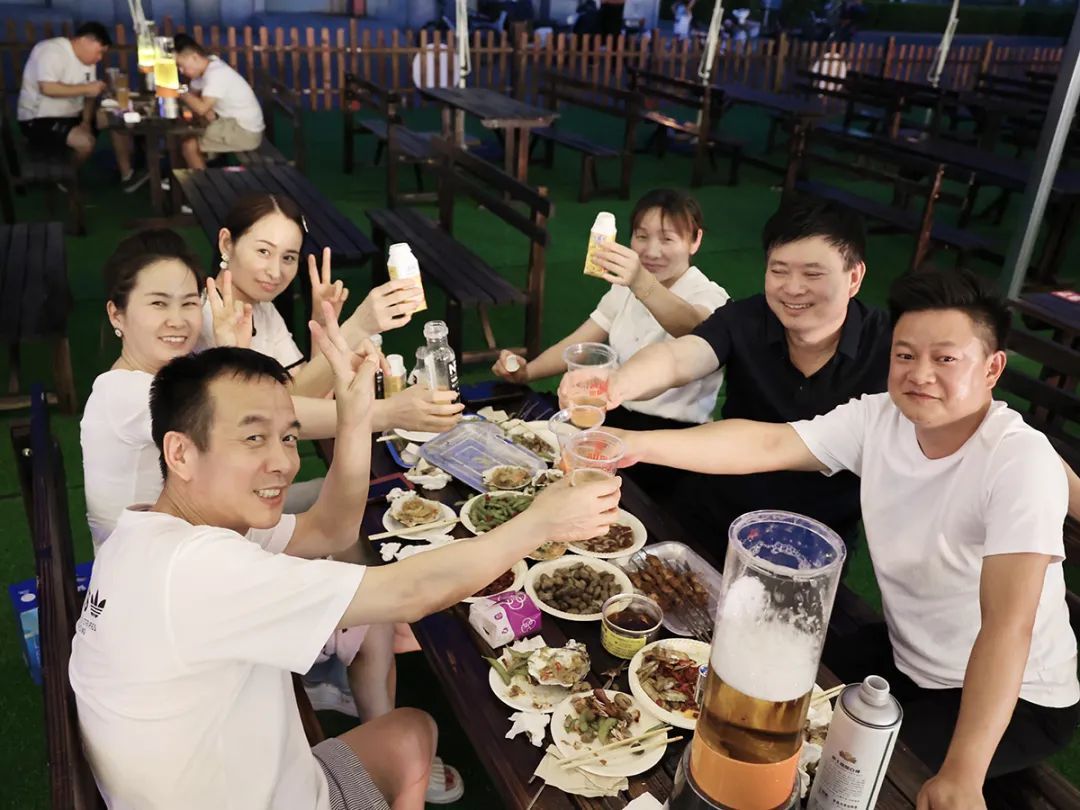 夕阳西下,晚霞在天际镀上一层金红,微风拂过,香气四溢。在这里,市民们可与三五好友相约举杯畅饮,尽享夏日夜晚的美好时光。市民徐先生说:“运动结束我会在这里和家人一起吃点烤串,喝点啤酒,我觉得这里的氛围很不错,是个消夏的好地方。”