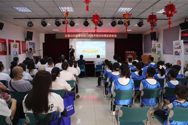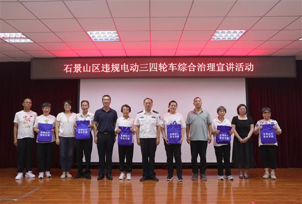7月20日上午,石景山区交通支队交通安全宣讲团走进八角街道八角北路社区开展违规电动三四轮车综合治理宣讲活动,辖区居民和青少年60余人参加活动。区交通支队、区委宣传部及八角街道相关领导出席。