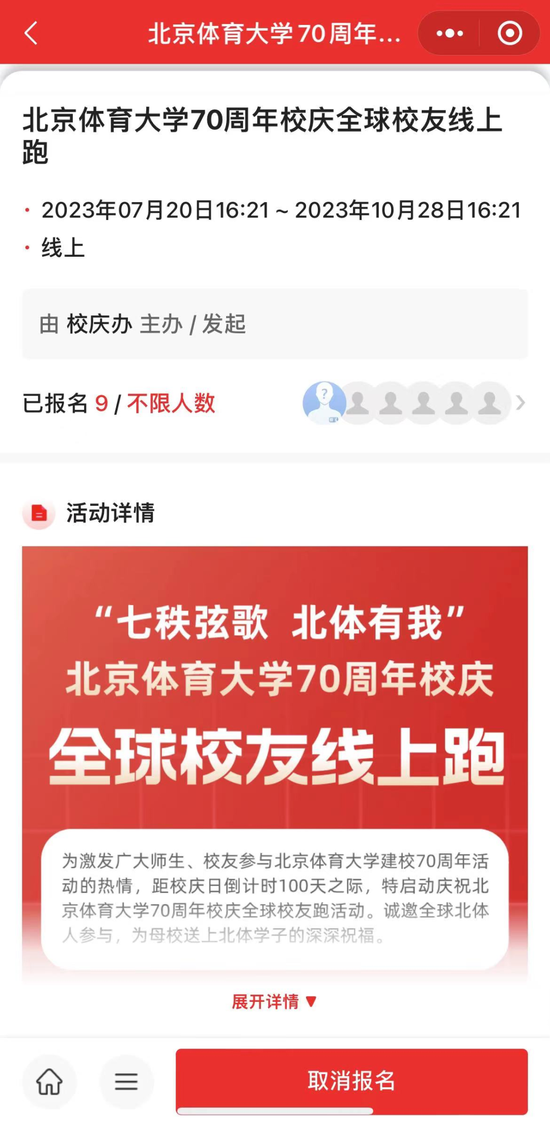1、参与该活动的校友需先实名注册“北京体育大学校友服务平台”小程序。在小程序专栏内的“活动掠影”里上传照片,上传的照片建议为跑步公里数为7km、70km,或“70、北体”字样的路线图。