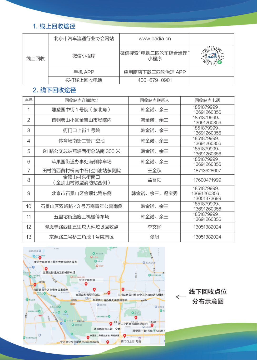 违规电动三四轮车线上回收途径、石景山区线下回收点位如下: