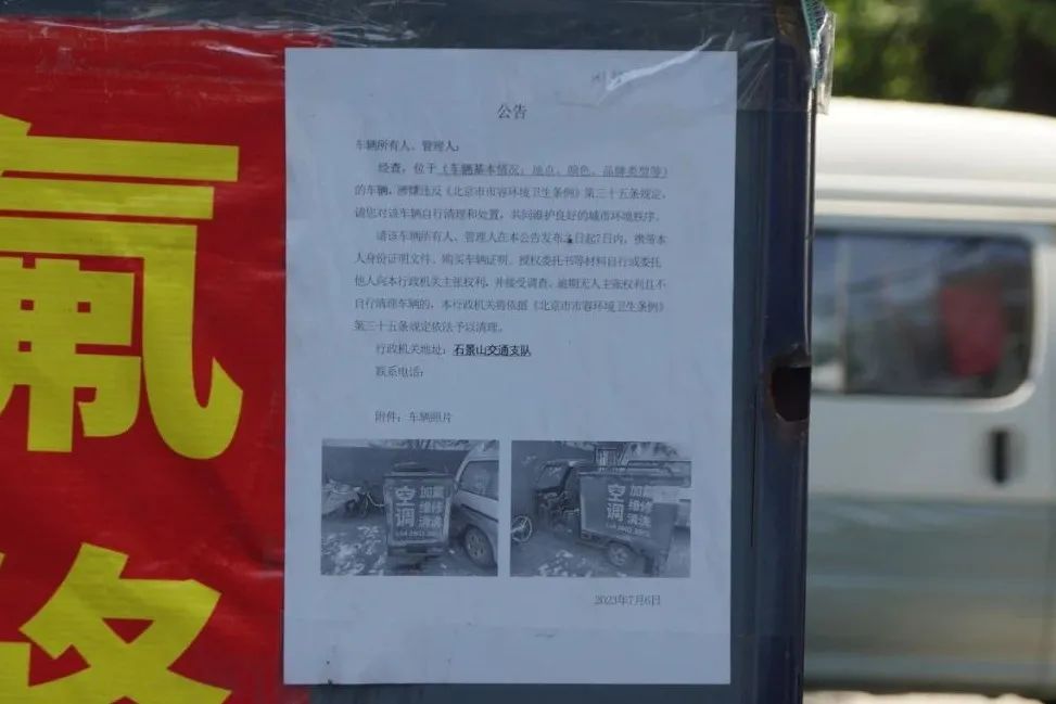 整治行动开展前期,社区居委会通过线上发布微信公众号公告和线下张贴公告的形式,公布辖区违法停放的“僵尸车”,通知车主在限期内自行清理,11位“僵尸车”所有者在限期内完成清理。