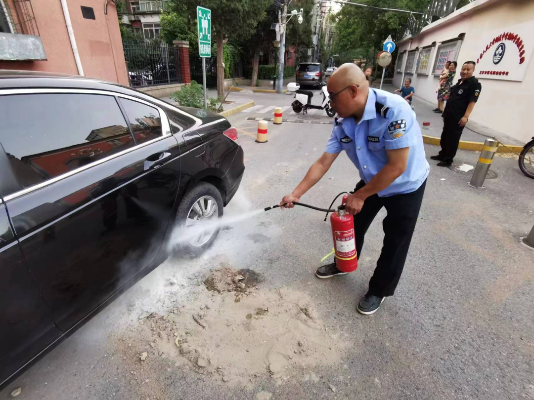 方案制定后,房管所工作人员立即从防灾物资存放处运送四袋沙子到现场,配合社区治安员进行路面铺洒和掩埋汽油;社区消防员使用灭火器对车底部以及路面漏油的位置进行喷洒覆盖;首华停车管理人员设置安全警示标志后,协助两位车主报警;学校安排值班主任带领学校保安现场维护秩序。