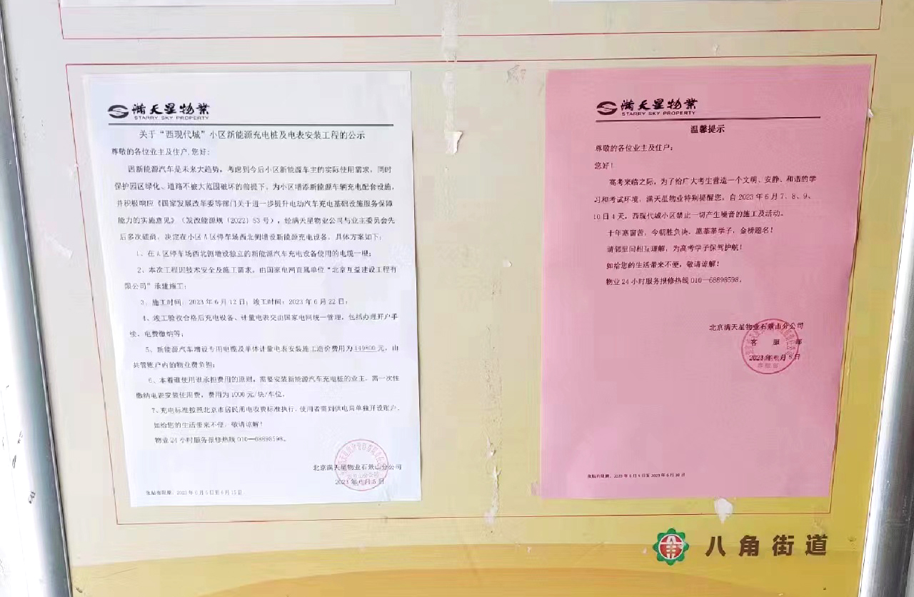 在摸清了需求底数后,供电局设计并制定了详细的施工方案,由社区工作人员在小区内各公示栏张贴通知公告,告知居民在小区原有车位总数不变的情况下,将位于西现代城28号楼1单元北侧的A区停车场划为集中安装充电桩的改造区域,有充电需求的居民可自行申请将车位及充电桩调整到A区。