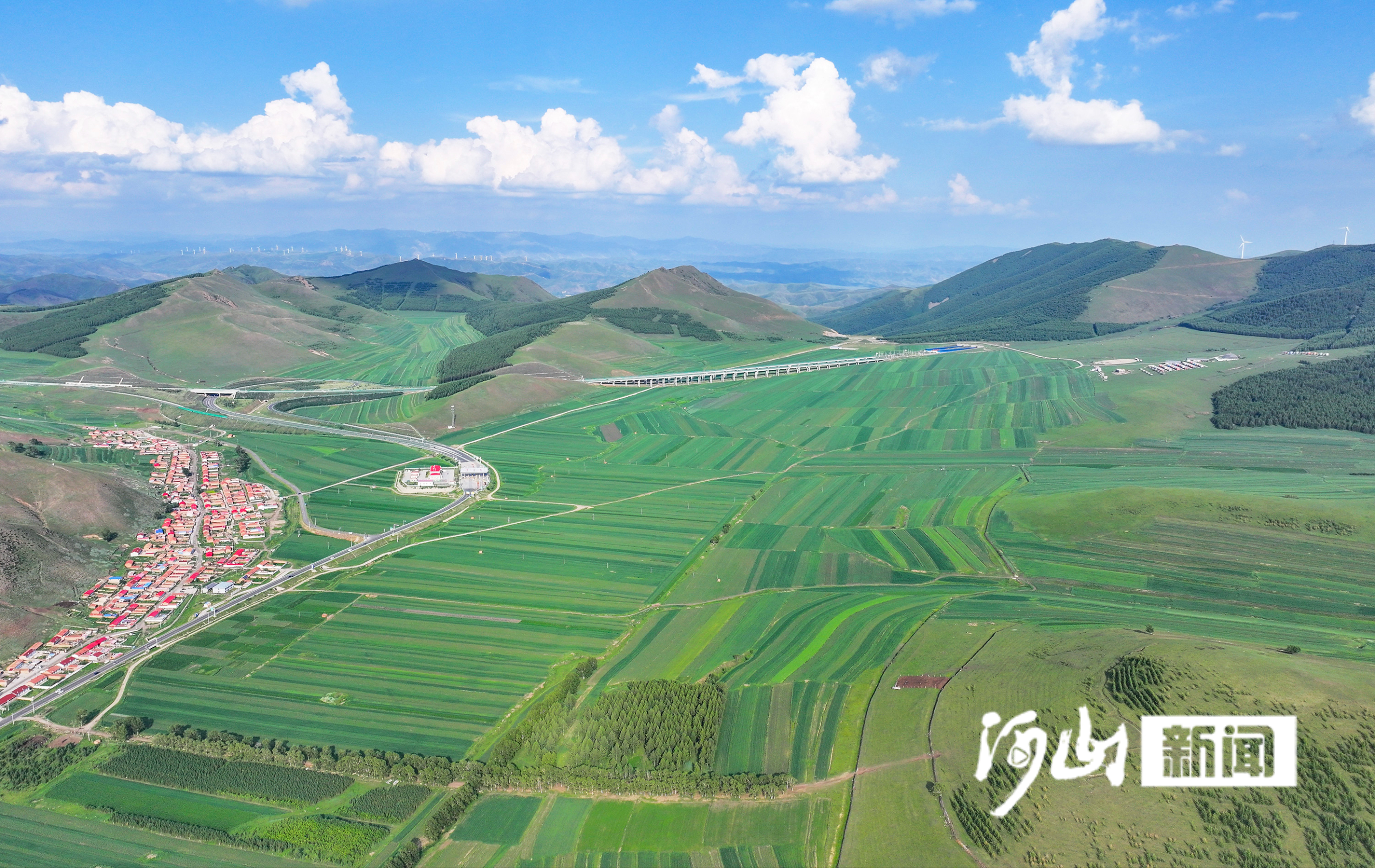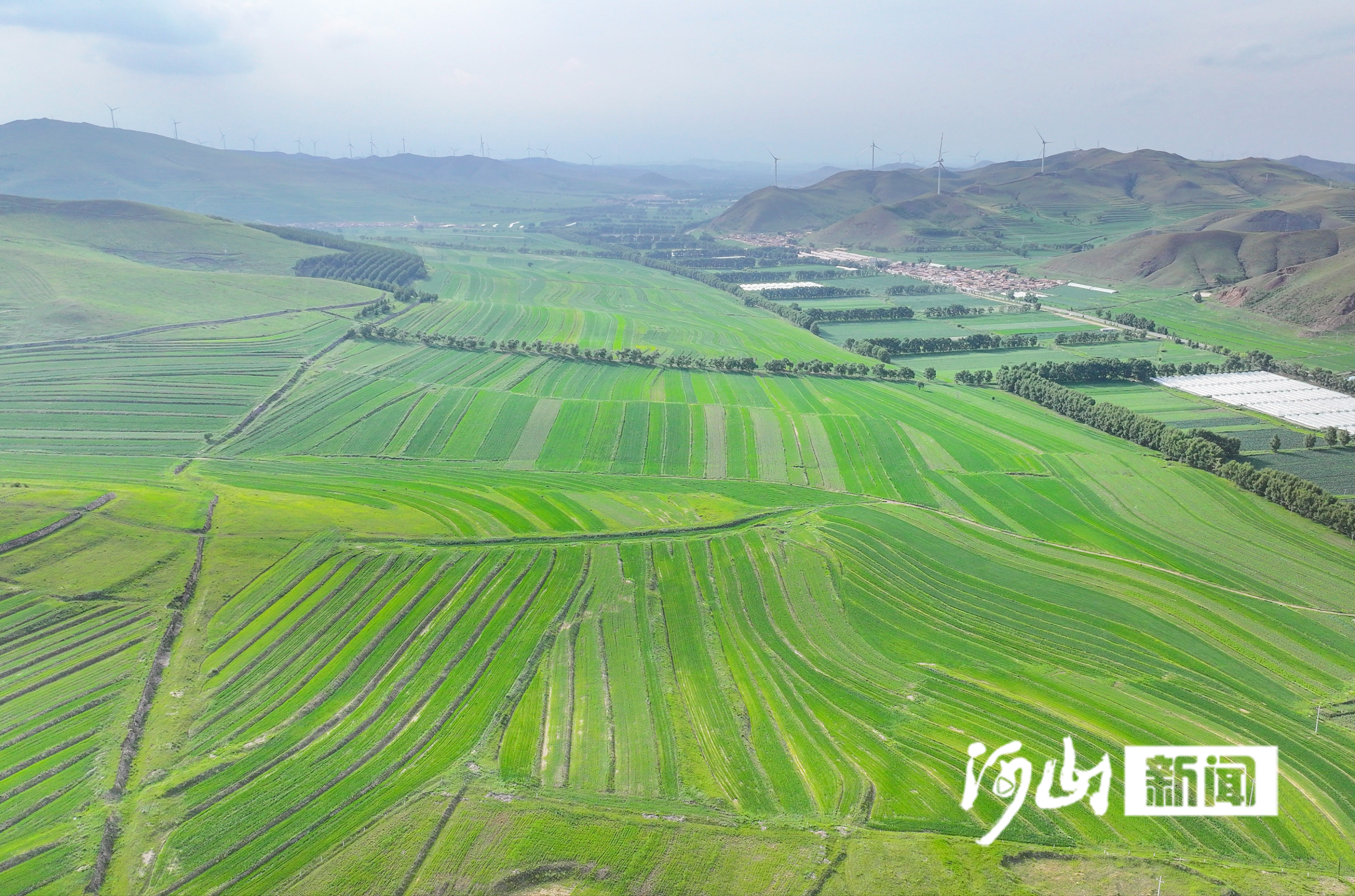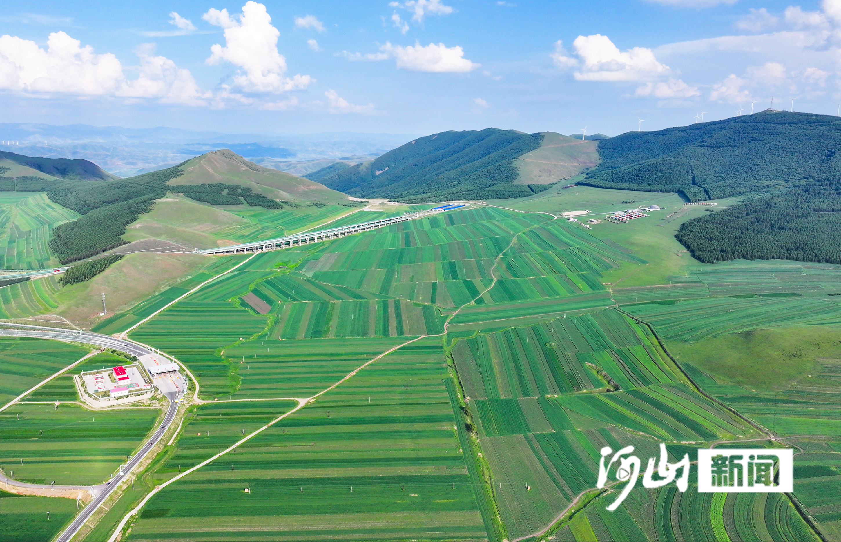 盛夏时节,在张家口张北县战海境内,嫩绿、泛黄的梯田纵横交错,蜿蜒的张承高速穿行其中,与远处的大风车交相辉映,形成一幅绝美的风景画卷。