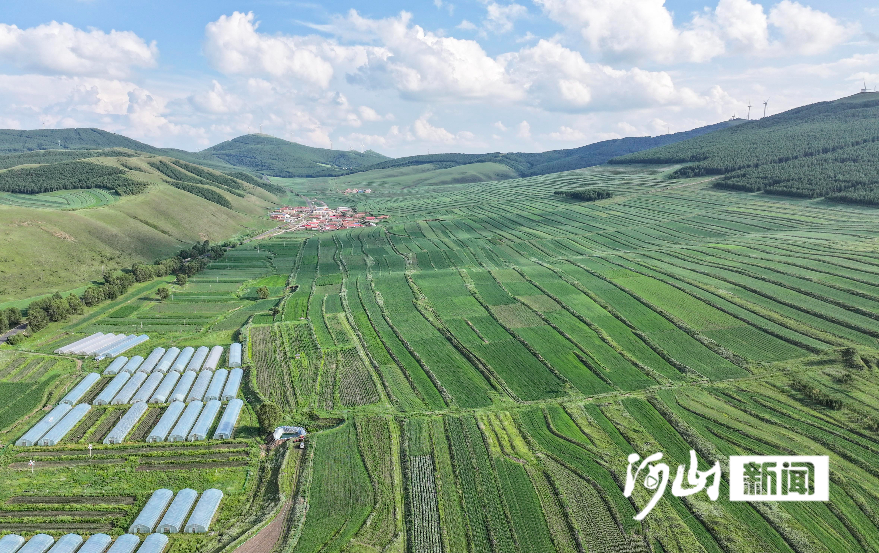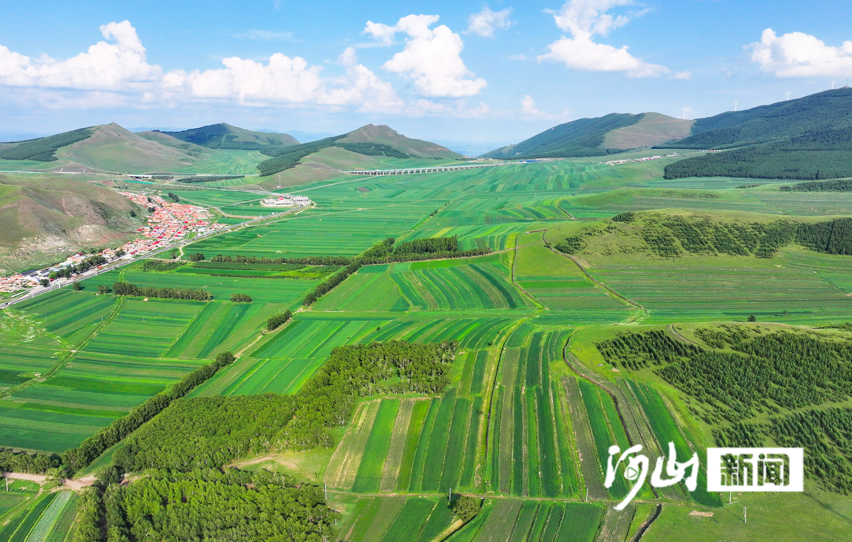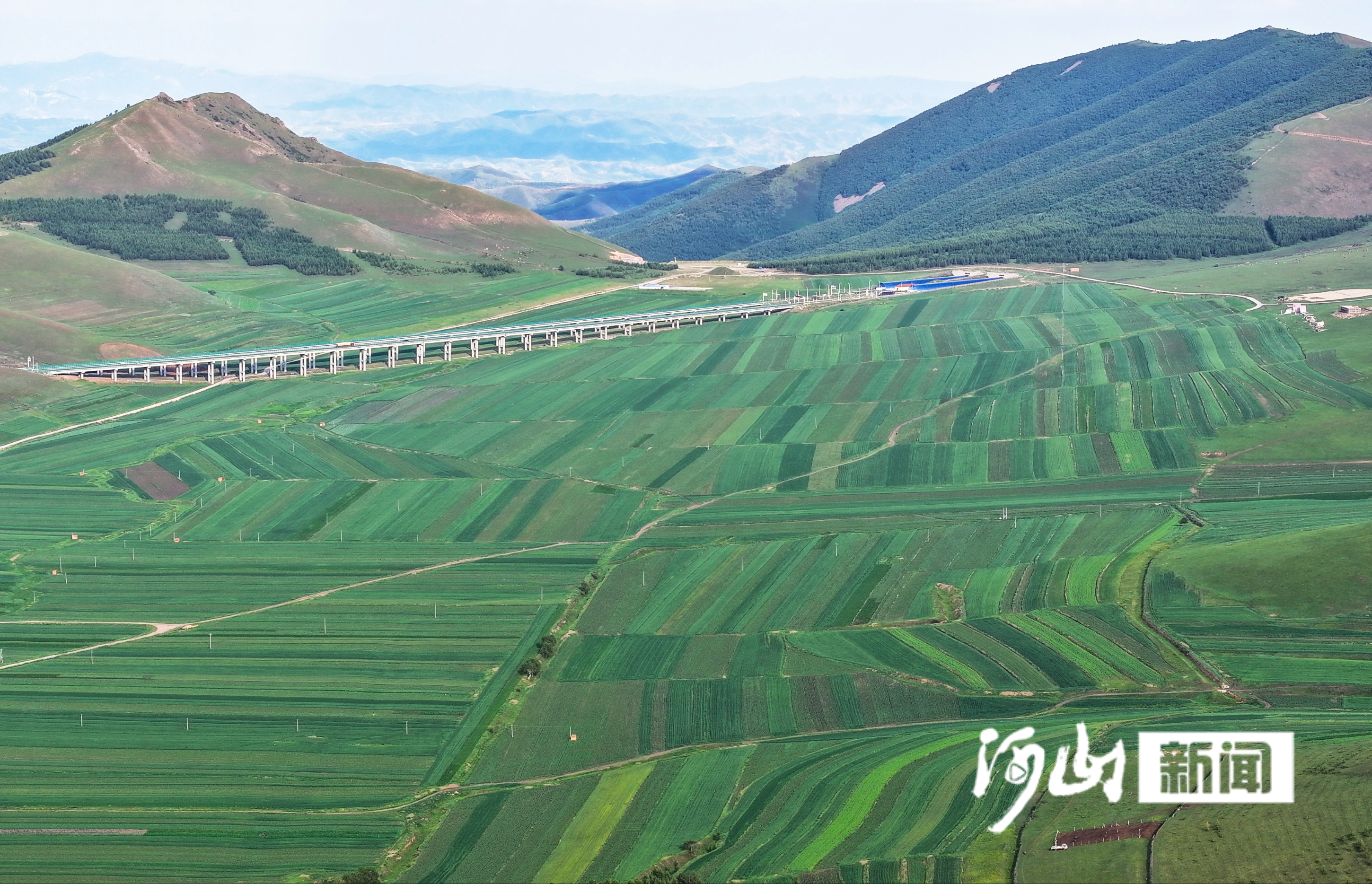 盛夏时节,在张家口张北县战海境内,嫩绿、泛黄的梯田纵横交错,蜿蜒的张承高速穿行其中,与远处的大风车交相辉映,形成一幅绝美的风景画卷。