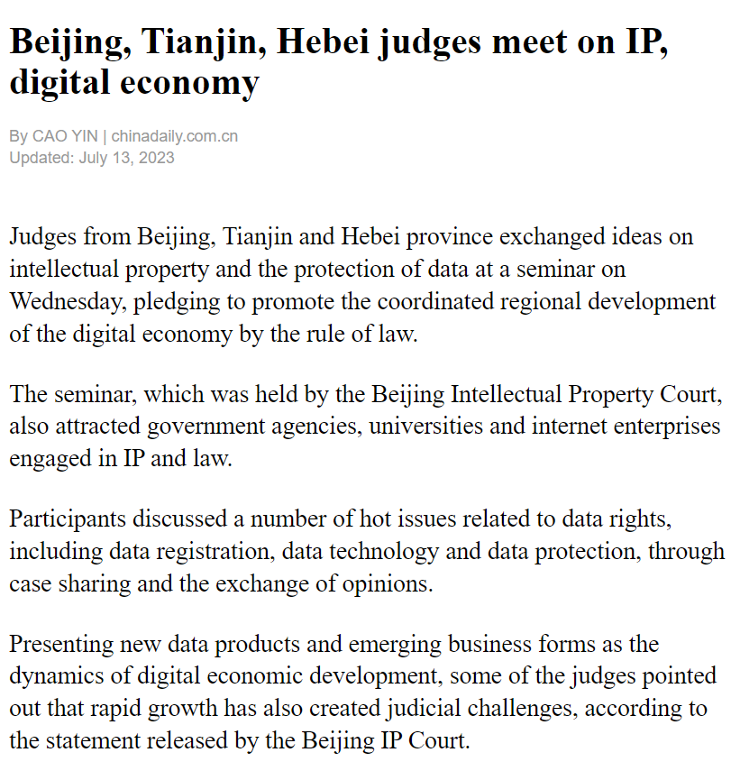 中国日报:Beijing, Tianjin, Hebei judges meet on IP, digital economy