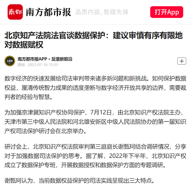 南方都市报APP • 反垄断前沿:北京知产法院法官谈数据保护:建议审慎有序有限地对数据赋权