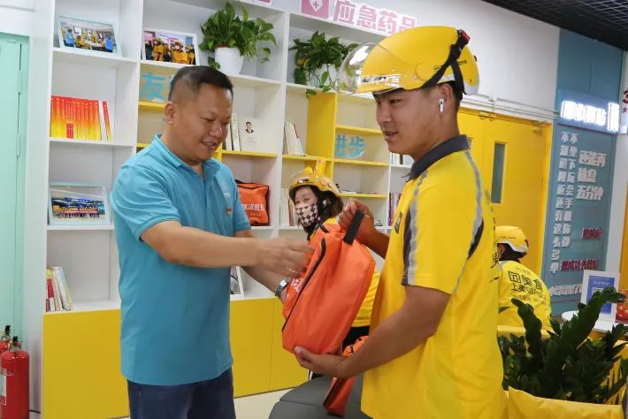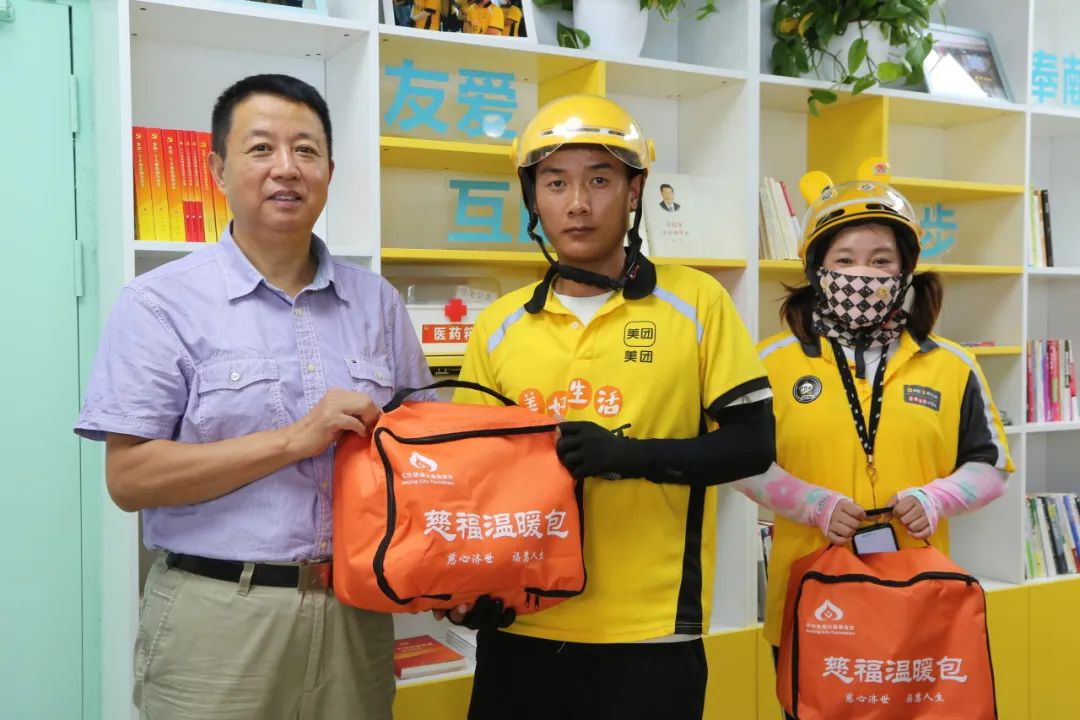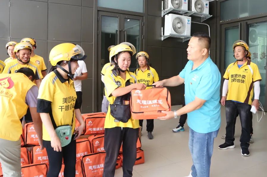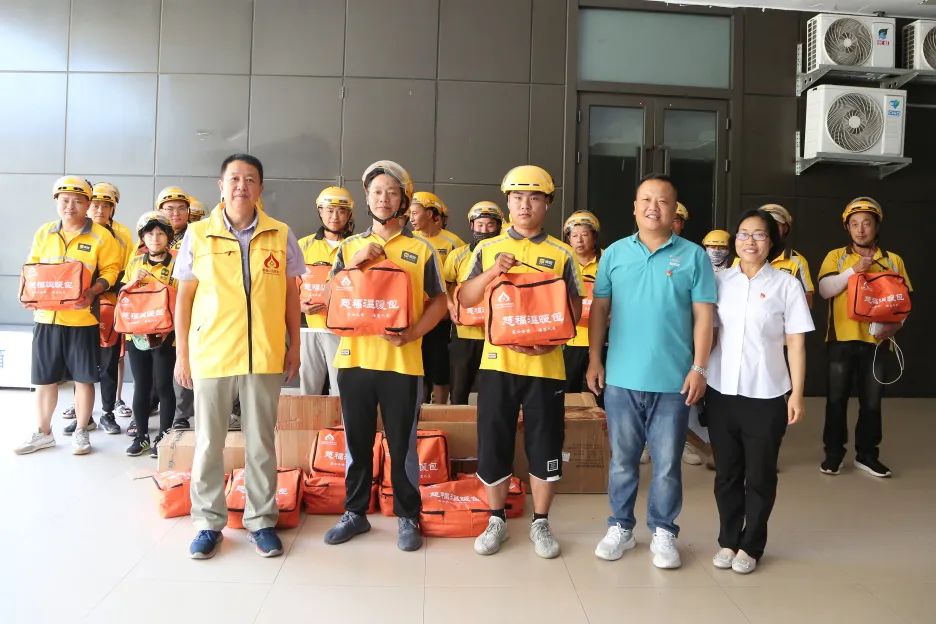 天宫院街道天街商圈党群服务站工作人员与北京慈福公益基金会负责人一起,为服务于龙湖天街购物中心商圈的外卖小哥送上“防暑清凉爱心包”,内含雨衣、防暑降温包组合、水杯、毛巾等日常生活中的必需品,为辛勤奔忙的“小哥”送上专属“关怀”和夏日清凉。
