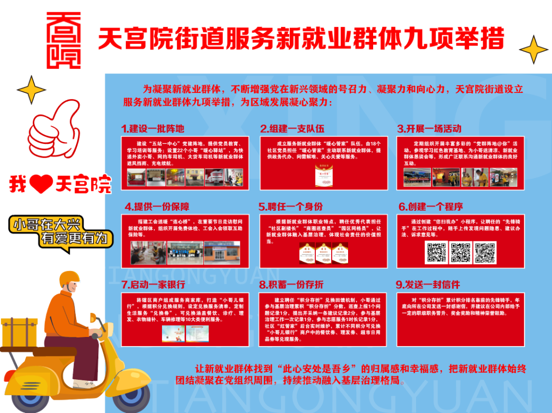 天宫院街道发挥党建引领作用,依托“五站一中心”党建服务阵地,从暖心服务机制入手,针对新就业群体推出了《天宫院街道服务新就业群体九项举措》,先后建设了22个“暖心驿站”,还聘请了18位“暖心管家”,开设了“小哥银行”等,切实推动新就业群体成为城市“治理增量”。